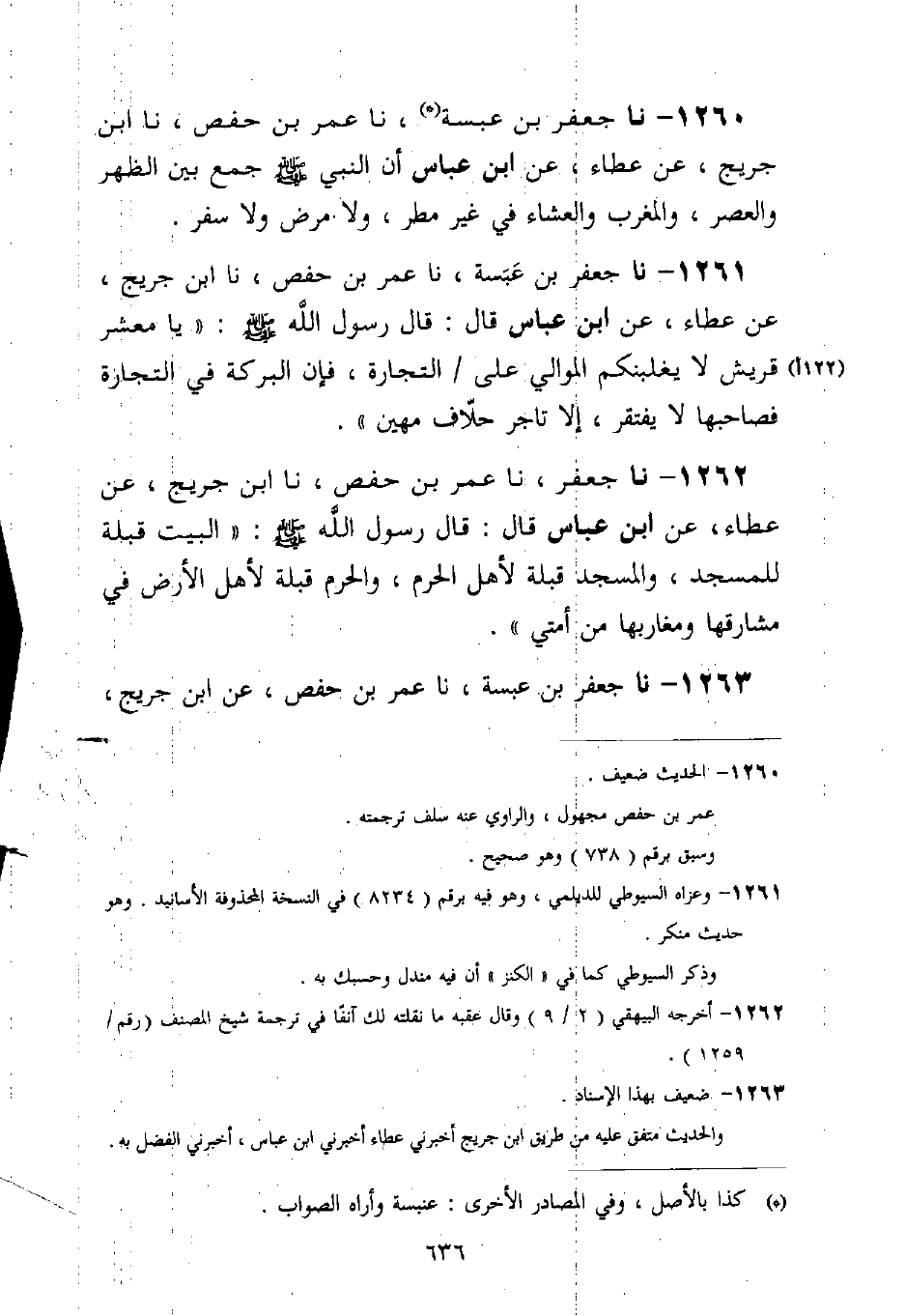 1260 - نا جَعْفَرُ بْنُ عَنْبَسَةَ، نا عُمَرُ بْنُ حَفْصٍ، نا ابْنُ جُرَيْجٍ، عَنْ عَطَاءٍ عَنِ ابْنِ عَبَّاسٍ، أَنَّ النَّبِيَّ صَلَّى اللَّهُ عَلَيْهِ وَسَلَّمَ §جَمَعَ بَيْنَ الظُّهْرِ وَالْعَصْرِ، وَالْمَغْرِبِ وَالْعِشَاءِ فِي غَيْرِ مَطَرٍ، وَلَا مَرَضٍ وَلَا سَفَرٍ