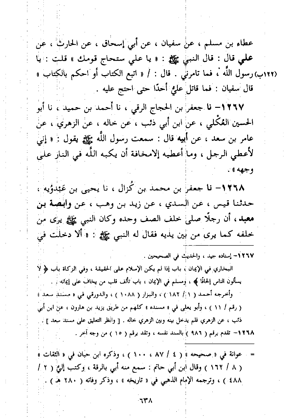 1267 - نا جَعْفَرُ بْنُ الْحَجَّاجِ الرَّقِّيُّ، نا أَحْمَدُ بْنُ حُمَيْدٍ، نا أَبُو الْحُسَيْنِ الْعُكْلِيُّ، عَنِ ابْنِ أَبِي ذِئْبٍ، عَنْ خَالِهِ، عَنِ الزُّهْرِيِّ عَنْ عَامِرِ بْنِ سَعْدٍ، عَنْ أَبِيهِ قَالَ: سَمِعْتُ رَسُولَ اللَّهِ صَلَّى اللَّهُ عَلَيْهِ وَسَلَّمَ يَقُولُ: §إِنِّي لَأُعْطِي الرَّجُلَ، وَمَا أُعْطِيهِ إِلَّا مَخَافَةَ أَنْ يَكُبَّهُ اللَّهُ فِي النَّارِ عَلَى وَجْهِهِ