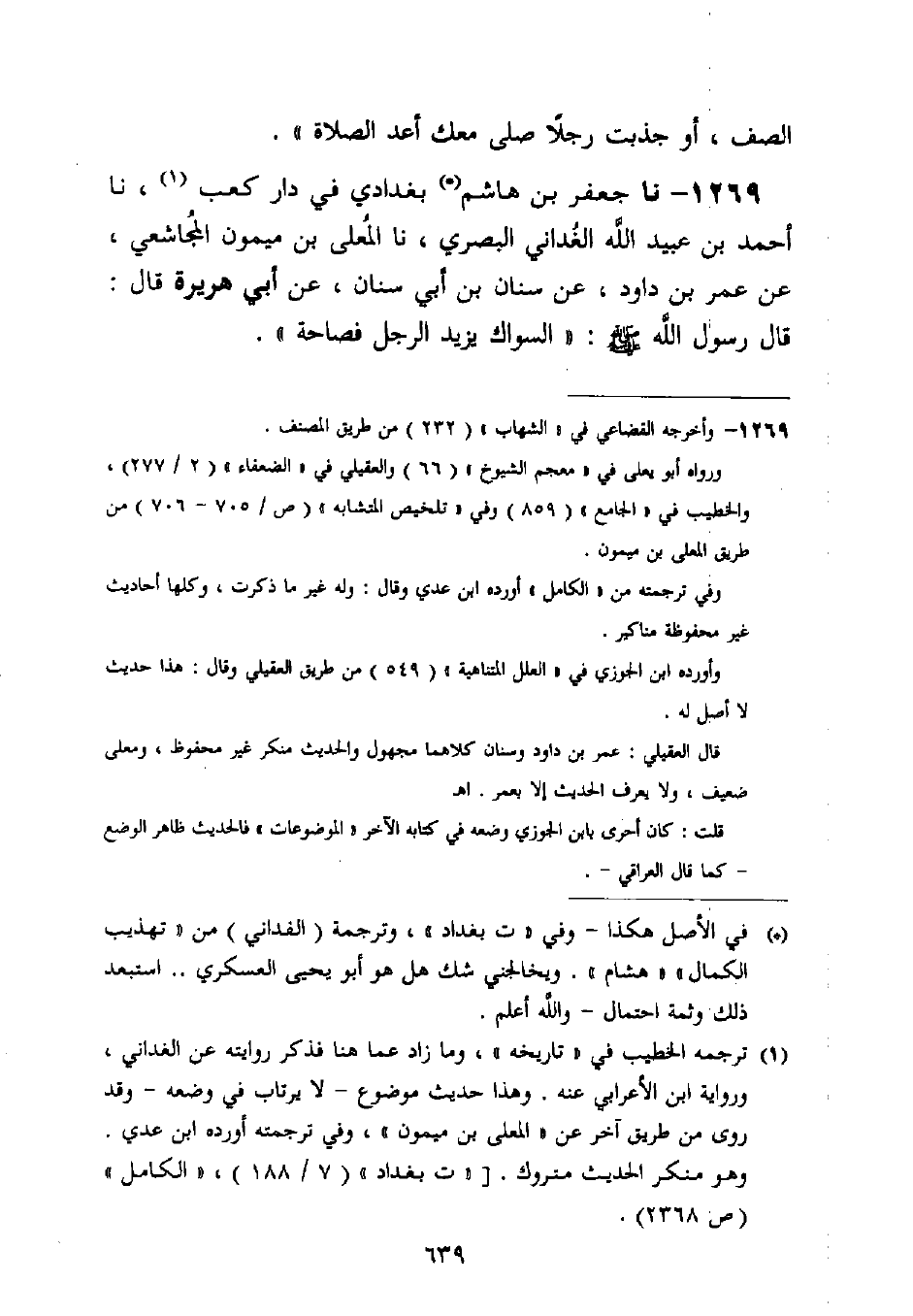 1269 - نا جَعْفَرُ بْنُ هَاشِمٍ، بَغْدَادِيٌّ فِي دَارِ كَعْبٍ، نا أَحْمَدُ بْنُ عُبَيْدِ اللَّهِ الْغُدَانِيُّ الْبَصْرِيُّ، نا الْمُعَلَّى بْنُ مَيْمُونٍ الْمُجَاشِعِيُّ، عَنْ عُمَرَ بْنِ دَاوُدَ، عَنْ سِنَانِ بْنِ أَبِي سِنَانٍ عَنْ أَبِي هُرَيْرَةَ قَالَ: قَالَ رَسُولُ اللَّهِ صَلَّى اللَّهُ عَلَيْهِ وَسَلَّمَ: §السِّوَاكُ يَزِيدُ الرَّجُلَ فَصَاحَةً