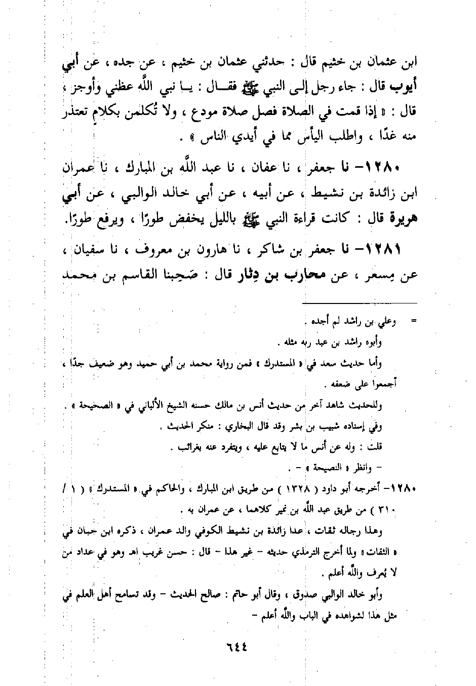 1280 - نا جَعْفَرٌ، نا عَفَّانُ، نا عَبْدُ اللَّهِ بْنُ الْمُبَارَكِ، نا عِمْرَانُ بْنُ زَائِدَةَ بْنِ نَشِيطٍ، عَنْ أَبِيهِ، عَنْ أَبِي خَالِدٍ الْوَالِبِيِّ عَنْ أَبِي هُرَيْرَةَ قَالَ: §كَانَتْ قِرَاءَةُ النَّبِيِّ صَلَّى اللَّهُ عَلَيْهِ وَسَلَّمَ بِاللَّيْلِ يَخْفِضُ طَوْرًا، وَيَرْفَعُ طَوْرًا