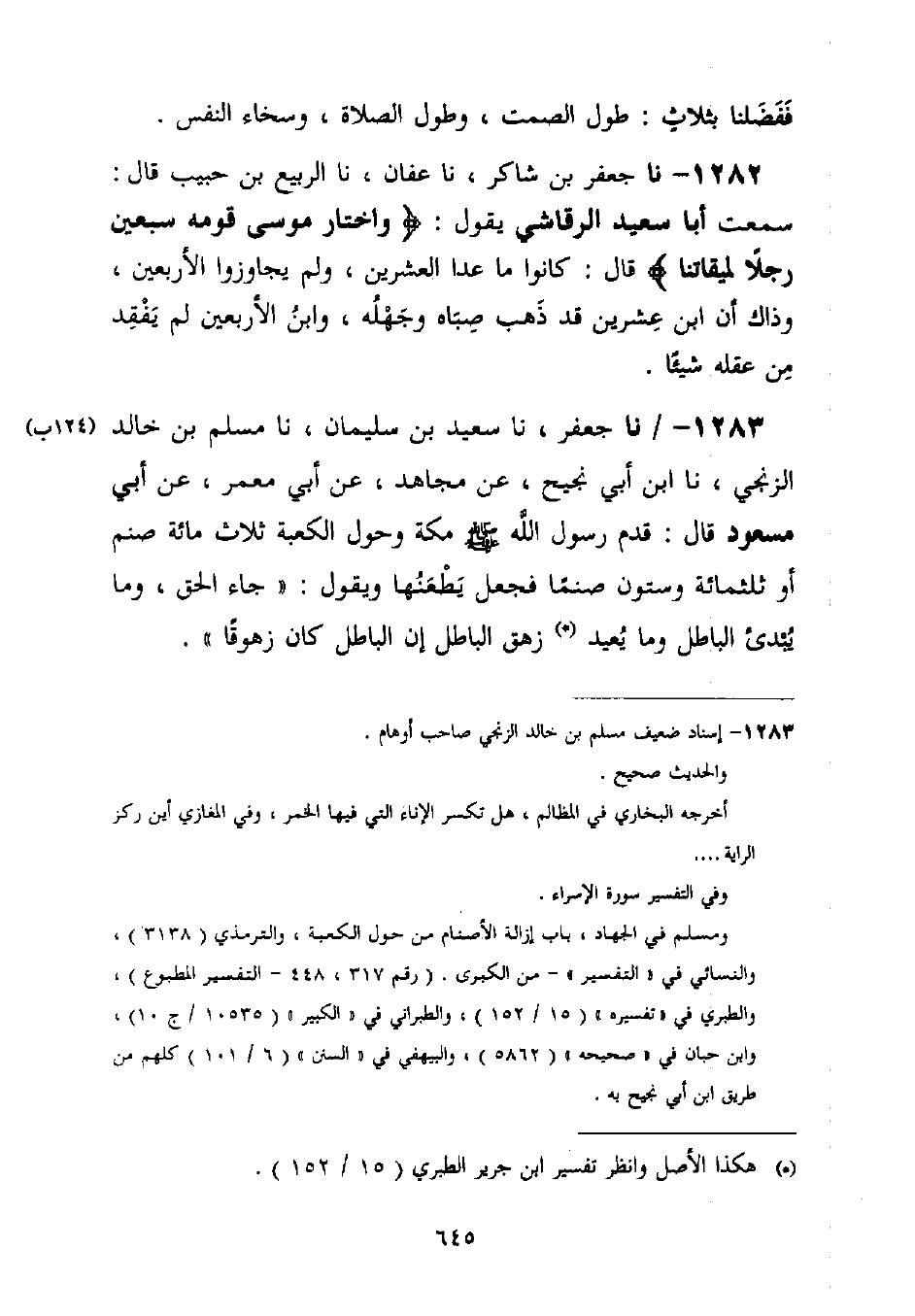 1283 - نا جَعْفَرٌ، نا سَعِيدُ بْنُ سُلَيْمَانَ، نا مُسْلِمُ بْنُ خَالِدٍ الزَّنْجِيُّ، نا ابْنُ أَبِي نَجِيحٍ، عَنْ مُجَاهِدٍ، عَنْ أَبِي مَعْمَرٍ عَنْ أَبِي مَسْعُودٍ قَالَ: قَدِمَ رَسُولُ اللَّهِ صَلَّى اللَّهُ عَلَيْهِ وَسَلَّمَ مَكَّةَ، وَحَوْلَ الْكَعْبَةِ ثَلَاثُ مِائَةِ صَنَمٍ أَوْ ثَلَثُمِائَةٍ وَسِتُّونَ صَنَمًا، فَجَعَلَ يَطْعَنُهَا وَيَقُولُ: §جَاءَ الْحَقُّ، وَمَا يُبْدِئُ الْبَاطِلُ وَمَا يُعِيدُ، زَهَقَ الْبَاطِلُ إِنَّ الْبَاطِلَ كَانَ زَهُوقًا