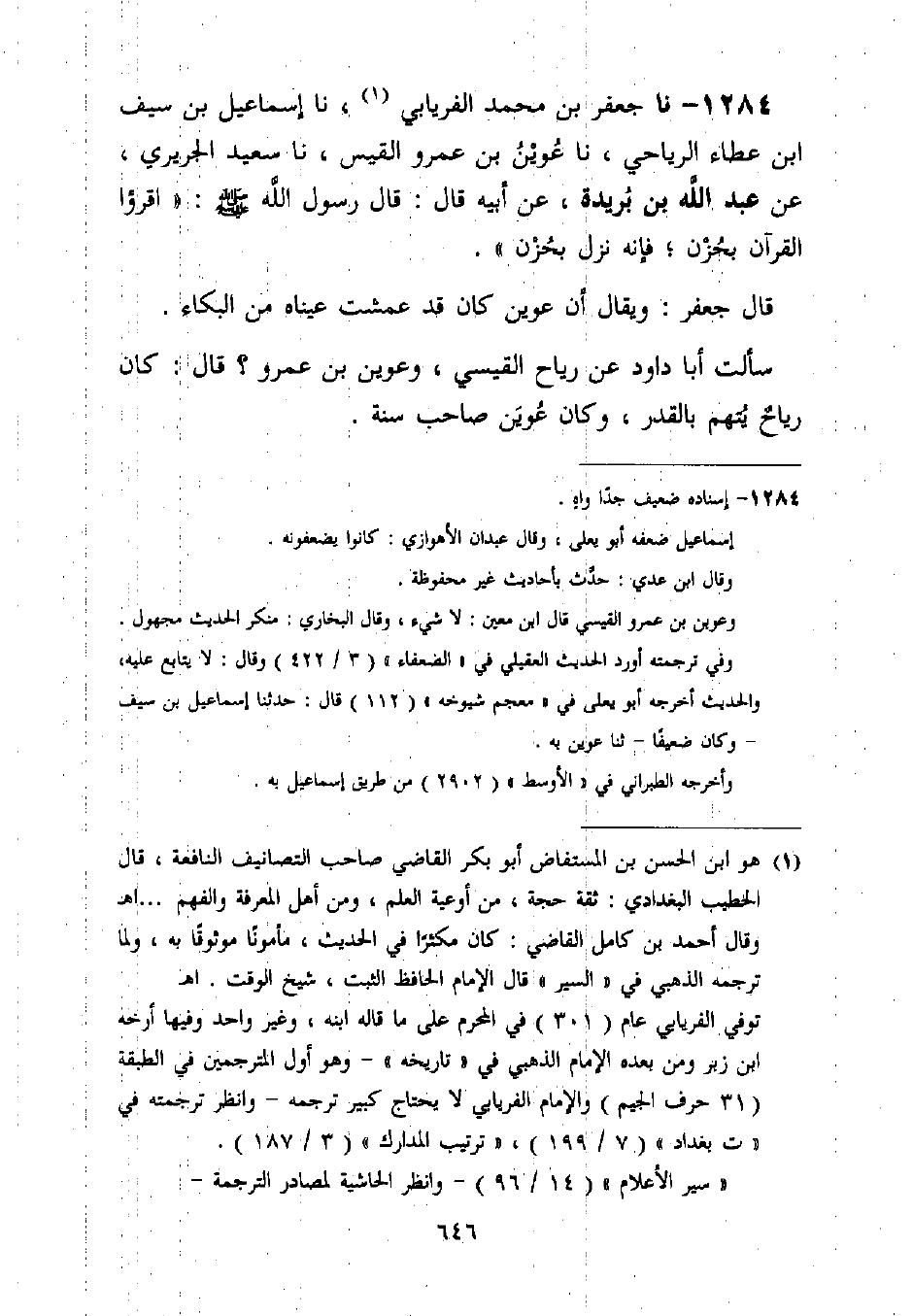 1284 - نا جَعْفَرُ بْنُ مُحَمَّدٍ الْفِرْيَابِيُّ، نا إِسْمَاعِيلُ بْنُ سَيْفِ بْنِ عَطَاءٍ الرِّيَاحِيُّ، نا عُوَيْنُ بْنُ عَمْرِو الْقَيْسِ، نا سَعِيدٌ الْجُرَيْرِيُّ عَنْ عَبْدِ اللَّهِ بْنِ بُرَيْدَةَ، عَنْ أَبِيهِ قَالَ: قَالَ رَسُولُ اللَّهِ صَلَّى اللَّهُ عَلَيْهِ وَسَلَّمَ: §اقْرَءُوا الْقُرْآنَ بِحُزْنٍ، فَإِنَّهُ نَزَلَ بِحُزْنٍ قَالَ جَعْفَرٌ: وَيُقَالُ: إِنَّ عُوَيْنَ كَانَ قَدْ عَمِشَتْ عَيْنَاهُ مِنَ الْبُكَاءِ. سَأَلْتُ أَبَا دَاوُدَ عَنْ رِيَاحٍ الْقَيْسِيِّ، وَعُوَيْنِ بْنِ عَمْرٍو؟ قَالَ: كَانَ رِيَاحٌ يُتَّهَمُ بِالْقَدَرِ، وَكَانَ عُوَيْنُ صَاحِبَ سُنَّةٍ