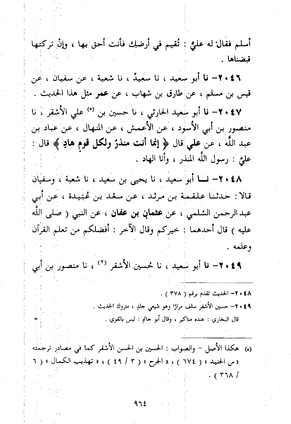 2047 - نا أَبُو سَعِيدٍ الْحَارِثِيُّ، نا حُسَيْنُ بْنُ عَلِيٍّ الْأَشْقَرُ، نا مَنْصُورُ بْنُ أَبِي الْأَسْوَدِ، عَنِ الْأَعْمَشِ، عَنِ الْمِنْهَالِ، عَنْ عَبَّادِ بْنِ عَبْدِ اللَّهِ، عَنْ عَلِيٍّ قَالَ: {§إِنَّمَا أَنْتَ مُنْذِرٌ وَلِكُلِّ قَوْمٍ هَادٍ} [الرعد: 7] قَالَ عَلِيٌّ: رَسُولُ اللَّهِ الْمُنْذِرُ، وَأَنَا الْهَادِ