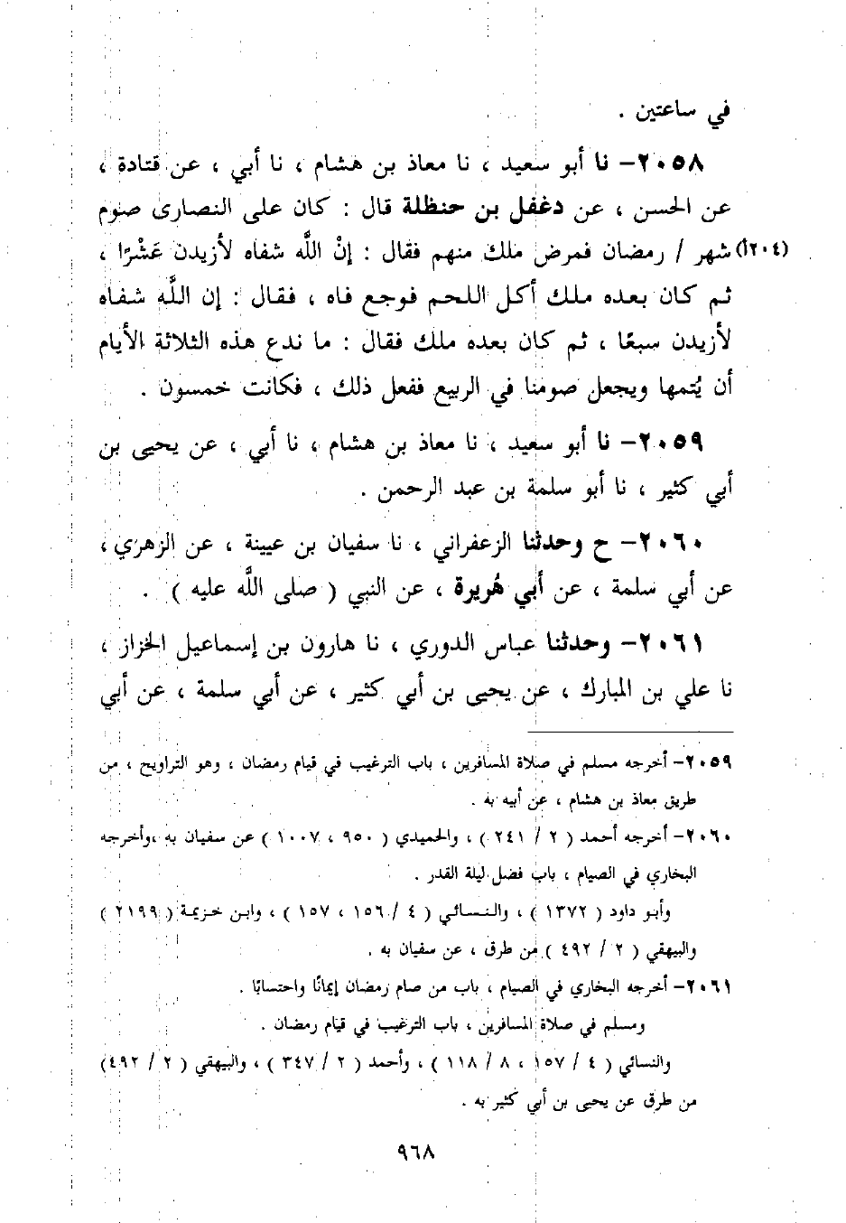 2058 - نا أَبُو سَعِيدٍ، نا مُعَاذُ بْنُ هِشَامٍ، نا أَبِي، عَنْ قَتَادَةَ، عَنِ الْحَسَنِ، عَنْ دَغْفَلِ بْنِ حَنْظَلَةَ قَالَ: §كَانَ عَلَى النَّصَارَى صَوْمُ شَهْرِ رَمَضَانَ، فَمَرِضَ مَلِكٌ مِنْهُمْ، فَقَالَ: إِنِ اللَّهُ شَفَاهُ لَأَزِيدَنَّ عَشْرًا، ثُمَّ كَانَ بَعْدَهُ مَلِكٌ أَكَلَ اللَّحْمَ فَوَجِعَ فَاهُ، فَقَالَ: إِنِ اللَّهُ شَفَاهُ لَأَزِيدَنَّ سَبْعًا، ثُمَّ كَانَ بَعْدَهُ مَلِكٌ، فَقَالَ: مَا نَدَعُ هَذِهِ الثَّلَاثَةَ الْأَيَّامِ أَنْ يُتِمَّهَا وَيَجْعَلَ صَوْمَنَا فِي الرَّبِيعِ، فَفَعَلَ ذَلِكَ، فَكَانَتْ خَمْسِينَ
