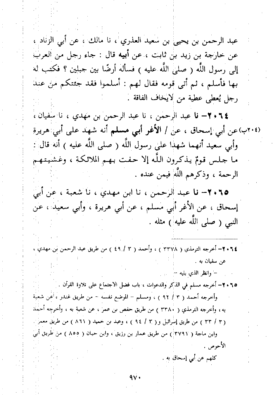 2064 - نا عَبْدُ الرَّحْمَنِ، نا عَبْدُ الرَّحْمَنِ بْنُ مَهْدِيٍّ، نا سُفْيَانُ، عَنْ أَبِي إِسْحَاقَ، عَنِ الْأَغَرِّ أَبِي مُسْلِمٍ، أَنَّهُ شَهِدَ عَلَى أَبِي هُرَيْرَةَ، وَأَبِي سَعِيدٍ، أَنَّهُمَا شَهِدَا عَلَى رَسُولِ اللَّهِ صَلَّى اللَّهُ عَلَيْهِ وَسَلَّمَ، أَنَّهُ قَالَ: §مَا جَلَسَ قَوْمٌ يَذْكُرُونَ اللَّهُ إِلَّا حَفَّتْ بِهِمُ الْمَلَائِكَةُ، وَغَشِيَتْهُمُ الرَّحْمَةُ، وَذَكَرَهُمُ اللَّهُ فِيمَنْ عِنْدَهُ