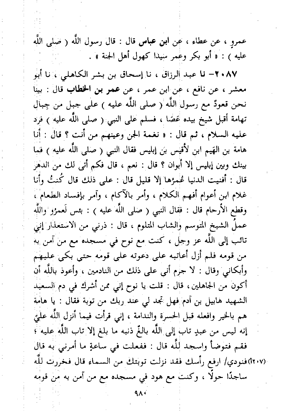 2087 - نا عَبْدُ الرَّزَّاقِ، نا إِسْحَاقُ بْنُ بِشْرٍ الْكَاهِلِيُّ، نا أَبُو مَعْشَرٍ، عَنْ نَافِعٍ، عَنِ ابْنِ عُمَرَ، عَنْ عُمَرَ بْنِ الْخَطَّابِ قَالَ: بَيْنَا نَحْنُ قُعُودٌ مَعَ رَسُولِ اللَّهِ صَلَّى اللَّهُ عَلَيْهِ وَسَلَّمَ عَلَى جَبَلٍ مِنْ جِبَالِ تِهَامَةَ أَقْبَلَ شَيْخٌ بِيَدِهِ عَصًا، فَسَلَّمَ عَلَى النَّبِيِّ صَلَّى اللَّهُ عَلَيْهِ وَسَلَّمَ فَرَدَّ عَلَيْهِ السَّلَامَ، ثُمَّ قَالَ: §نَغَمَةُ الْجِنِّ وَعَيْنُهُمْ مَنْ أَنْتَ؟ قَالَ: أَنَا هَامَةُ بْنُ الْهَيْمِ بْنِ لَأْقِيسِ بْنِ إِبْلِيسَ قَالَ النَّبِيُّ صَلَّى اللَّهُ عَلَيْهِ وَسَلَّمَ: فَمَا بَيْنَكَ وَبَيْنَ إِبْلِيسَ إِلَّا أَبَوَانِ؟ قَالَ: نَعَمْ قَالَ: فَكَمْ أَتَى لَكَ مِنَ الدَّهْرِ؟ قَالَ: أَفْنَيْتُ الدُّنْيَا عُمْرَهَا إِلَّا قَلِيلٌ قَالَ: عَلَى ذَلِكَ قَالَ: كُنْتُ وَأَنَا غُلَامٌ ابْنُ أَعْوَامٍ أَفْهَمُ الْكَلَامَ، وَأَمُرُّ بِالْآكَامِ، وَآمُرُ بِإِفْسَادِ الطَّعَامِ، وَقَطْعِ الْأَرْحَامِ قَالَ: فَقَالَ النَّبِيُّ صَلَّى اللَّهُ عَلَيْهِ وَسَلَّمَ: بِئْسَ لَعَمْرُوَ اللَّهِ عَمَلُ الشَّيْخِ الْمُتَوَسِّمِ وَالشَّابِّ الْمُتَلَوِّمِ قَالَ: ذَرْنِي مِنَ الِاسْتِعْذَارِ، إِنِّي تَائِبٌ إِلَى اللَّهِ عَزَّ وَجَلَّ، كُنْتُ مَعَ نُوحٍ فِي مَسْجِدِهِ مَعَ مَنْ آمَنَ بِهِ مِنْ قَوْمِهِ، فَلَمْ أَزَلْ أُعَاتِبُهُ عَلَى دَعْوَتِهِ عَلَى قَوْمِهِ حَتَّى بَكَى عَلَيْهِمْ وَأَبْكَانِي، وَقَالَ: لَا جَرَمَ أَنِّي عَلَى ذَلِكَ مِنَ النَّادِمِينَ، وَأَعُوذُ بِاللَّهِ أَنْ أَكُونَ مِنَ الْجَاهِلِينَ قَالَ: قُلْتُ: يَا نُوحُ إِنِّي مِمَّنْ أَشْرَكَ فِي دَمِ السَّعِيدِ الشَّهِيدِ هَابِيلَ بْنِ آدَمَ، فَهَلْ تَجِدُ لِي عِنْدَ رَبِّكَ مِنْ تَوْبَةٍ، فَقَالَ: يَا هَامَةُ هِمَّ بِالْخَيْرِ، وَافْعَلْهُ قَبْلَ الْحَسْرَةِ وَالنَّدَامَةِ، إِنِّي قَرَأْتُ فِيمَا أَنْزَلَ اللَّهُ عَلَيَّ: إِنَّهُ لَيْسَ مِنْ عَبْدٍ تَابَ إِلَى اللَّهِ بَالِغٌ ذَنْبُهُ مَا بَلَغَ إِلَّا تَابَ اللَّهُ عَلَيْهِ، فَقُمْ فَتَوَضَّأْ وَاسْجُدْ لِلَّهِ قَالَ: فَفَعَلْتُ فِي سَاعَةِ مَا أَمَرَنِي بِهِ قَالَ: فَنُودِيَ: ارْفَعْ رَأْسَكَ فَقَدْ نَزَلَتْ تَوْبَتُكَ مِنَ السَّمَاءِ قَالَ: فَخَرَرْتُ لِلَّهِ سَاجِدًا حَوْلًا، وَكُنْتُ مَعَ هُودٍ فِي مَسْجِدِهِ مَعَ مَنْ آمَنَ بِهِ مِنْ قَوْمِهِ، فَلَمْ أَزَلْ أُعَاتِبُهُ عَلَى دَعْوَتِهِ عَلَى قَوْمِهِ حَتَّى بَكَى عَلَيْهِمْ وَأَبْكَانِي، وَقَالَ: لَا جَرَمَ أَنِّي عَلَى ذَلِكَ مِنَ النَّادِمِينَ، وَأَعُوذُ بِاللَّهِ أَنْ أَكُونَ مِنَ الْجَاهِلِينَ، وَكُنْتُ مَعَ صَالِحٍ فِي مَسْجِدِهِ مَعَ مَنْ آمَنَ بِهِ مِنْ قَوْمِهِ، -[981]- فَلَمْ أَزَلْ أُعَاتِبُهُ عَلَى دَعْوَتِهِ عَلَى قَوْمِهِ، حَتَّى بَكَى عَلَيْهِمْ وَأَبْكَانِي، وَكُلُّهُمْ يَقُولُ: أَنَا عَلَى ذَلِكَ مِنَ النَّادِمِينَ، وَأَعُوذُ بِاللَّهِ أَنْ أَكُونَ مِنَ الْجَاهِلِينَ، وَكُنْتُ زَوَّارًا لِيَعْقُوبَ، وَكُنْتُ مِنْ يُوسُفَ بِالْمَكَانِ الْمُبِينِ، وَكُنْتُ أَلْقَى إِلْيَاسَ فِي الْأَوْدِيَةِ، وَأَنَا أَلْقَاهُ الْآنَ، وَإِنِّي لَقِيتُ مُوسَى بْنَ عِمْرَانَ وَعَلَّمَنِي مِنَ التَّوْرَاةِ، وَقَالَ لِي: إِنْ لَقِيتَ عِيسَى ابْنَ مَرْيَمَ فَأَقْرِئْهُ مِنِّي السَّلَامَ، وَإِنَّ عِيسَى قَالَ لِي: إِنْ لَقِيتَ مُحَمَّدًا فَأَقْرِئْهُ مِنِّي السَّلَامَ، فَأَرْسَلَ رَسُولُ اللَّهِ صَلَّى اللَّهُ عَلَيْهِ وَسَلَّمَ عَيْنَهُ فَبَكَى، ثُمَّ قَالَ: وَعَلَى عِيسَى السَّلَامُ مَا دَامَتِ الدُّنْيَا وَعَلَيْكَ السَّلَامُ، يَا هَامَةُ لِأَدَائِكَ الْأَمَانَةَ قَالَ هَامَةُ: قُلْتُ: يَا رَسُولَ اللَّهِ افْعَلْ بِي مَا فَعَل