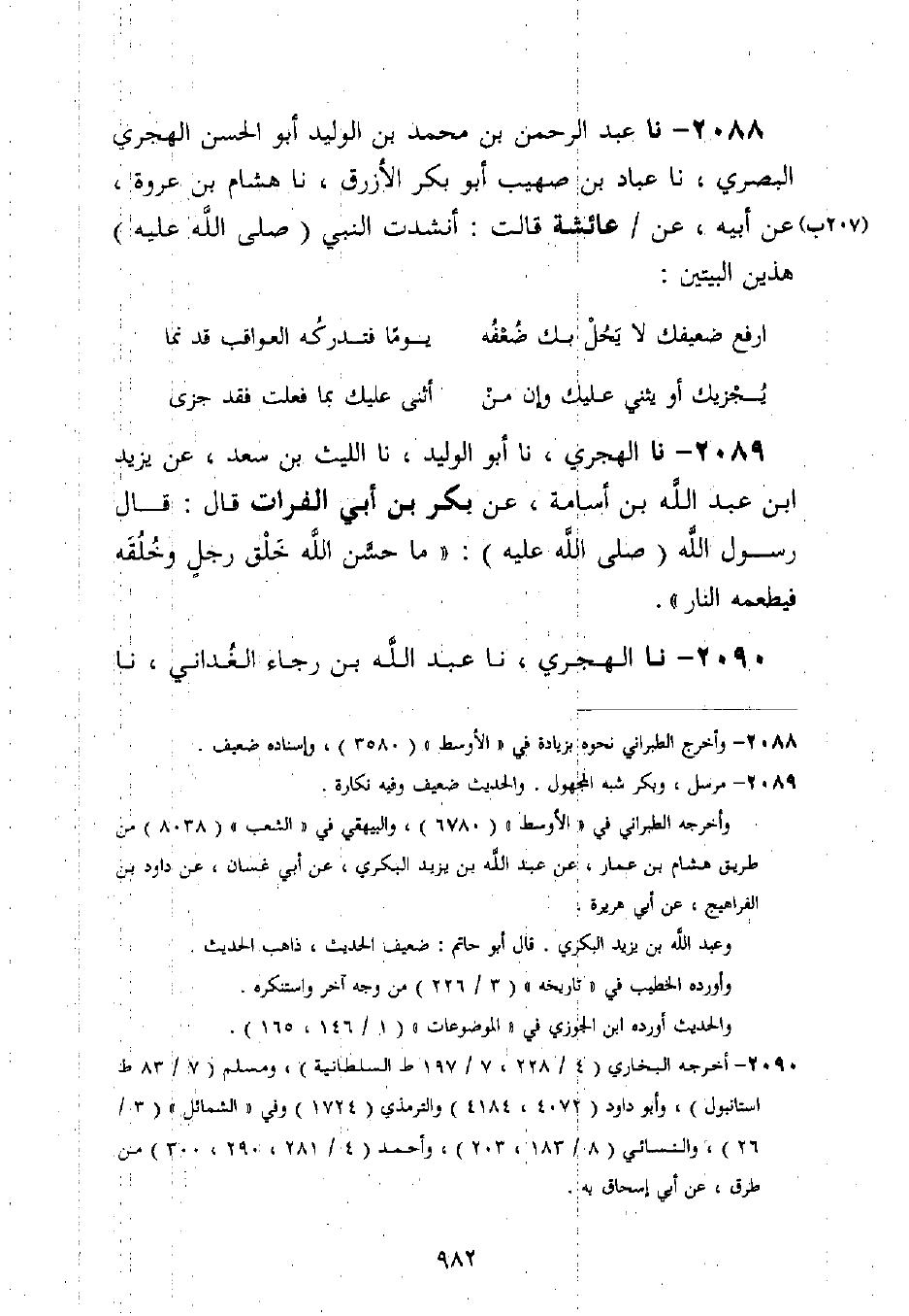2088 - نا عَبْدُ الرَّحْمَنِ بْنُ مُحَمَّدِ بْنِ الْوَلِيدِ أَبُو الْحَسَنِ الْهَجَرِيُّ الْبَصْرِيُّ، نا عَبَّادُ بْنُ صُهَيْبٍ أَبُو بَكْرٍ الْأَزْرَقُ، نا هِشَامُ بْنُ عُرْوَةَ، عَنْ أَبِيهِ، عَنْ عَائِشَةَ قَالَتْ: §أَنْشَدْتُ النَّبِيَّ صَلَّى اللَّهُ عَلَيْهِ وَسَلَّمَ هَذَيْنِ الْبَيْتَيْنِ:
