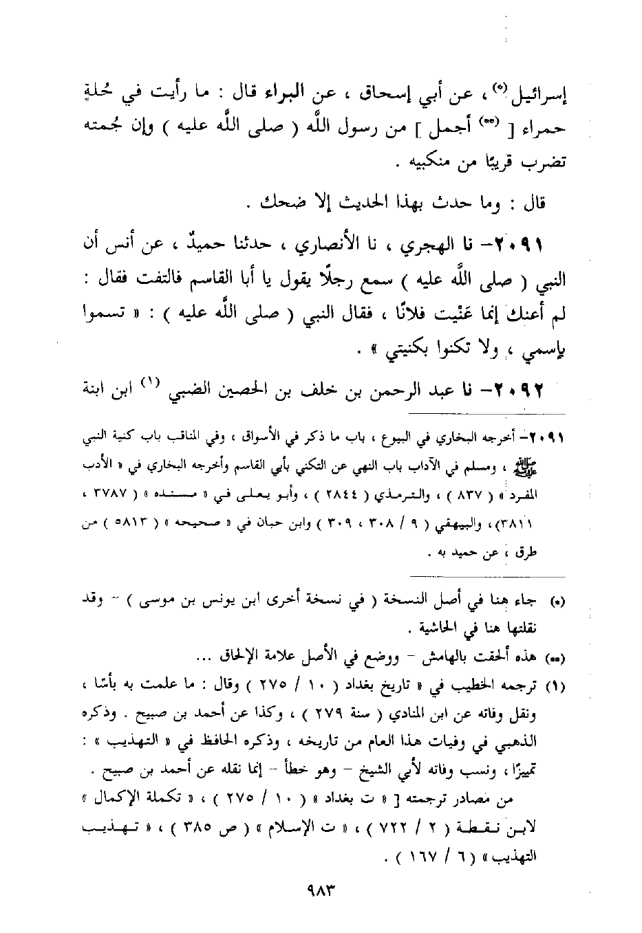 2091 - نا الْهَجَرِيُّ، نا الْأَنْصَارِيُّ، حَدَّثَنَا حُمَيْدٌ، عَنْ أَنَسٍ، أَنَّ النَّبِيَّ صَلَّى اللَّهُ عَلَيْهِ وَسَلَّمَ سَمِعَ رَجُلًا يَقُولُ: يَا أَبَا الْقَاسِمِ فَالْتَفَتَ، فَقَالَ: لَمْ أَعْنِكَ، إِنَّمَا عَنَيْتُ فُلَانًا، فَقَالَ النَّبِيُّ صَلَّى اللَّهُ عَلَيْهِ وَسَلَّمَ: §تَسَمُّوا بِاسْمِي، وَلَا تَكَنُّوا بِكُنْيَتِي