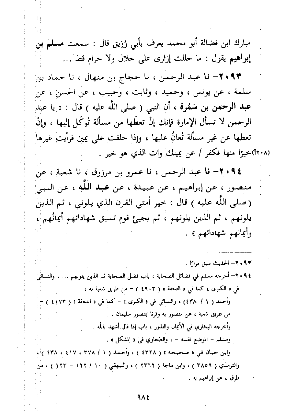 2094 - نا عَبْدُ الرَّحْمَنِ، نا عَمْرُو بْنُ مَرْزُوقٍ، نا شُعْبَةُ، عَنْ مَنْصُورٍ، عَنْ إِبْرَاهِيمَ، عَنْ عُبَيْدَةَ، عَنْ عَبْدِ اللَّهِ، عَنِ النَّبِيِّ صَلَّى اللَّهُ عَلَيْهِ وَسَلَّمَ قَالَ: §خَيْرُ أُمَّتِيَ الْقَرْنُ الَّذِي يَلُونِي، ثُمَّ الَّذِينَ يَلُونَهُمْ، ثُمَّ الَّذِينَ يَلُونَهُمْ، ثُمَّ يَجِيءُ قَوْمٌ تَسْبِقُ شَهَادَاتُهُمْ أَيْمَانَهُمْ، وَأَيْمَانُهُمْ شَهَادَاتِهُمْ