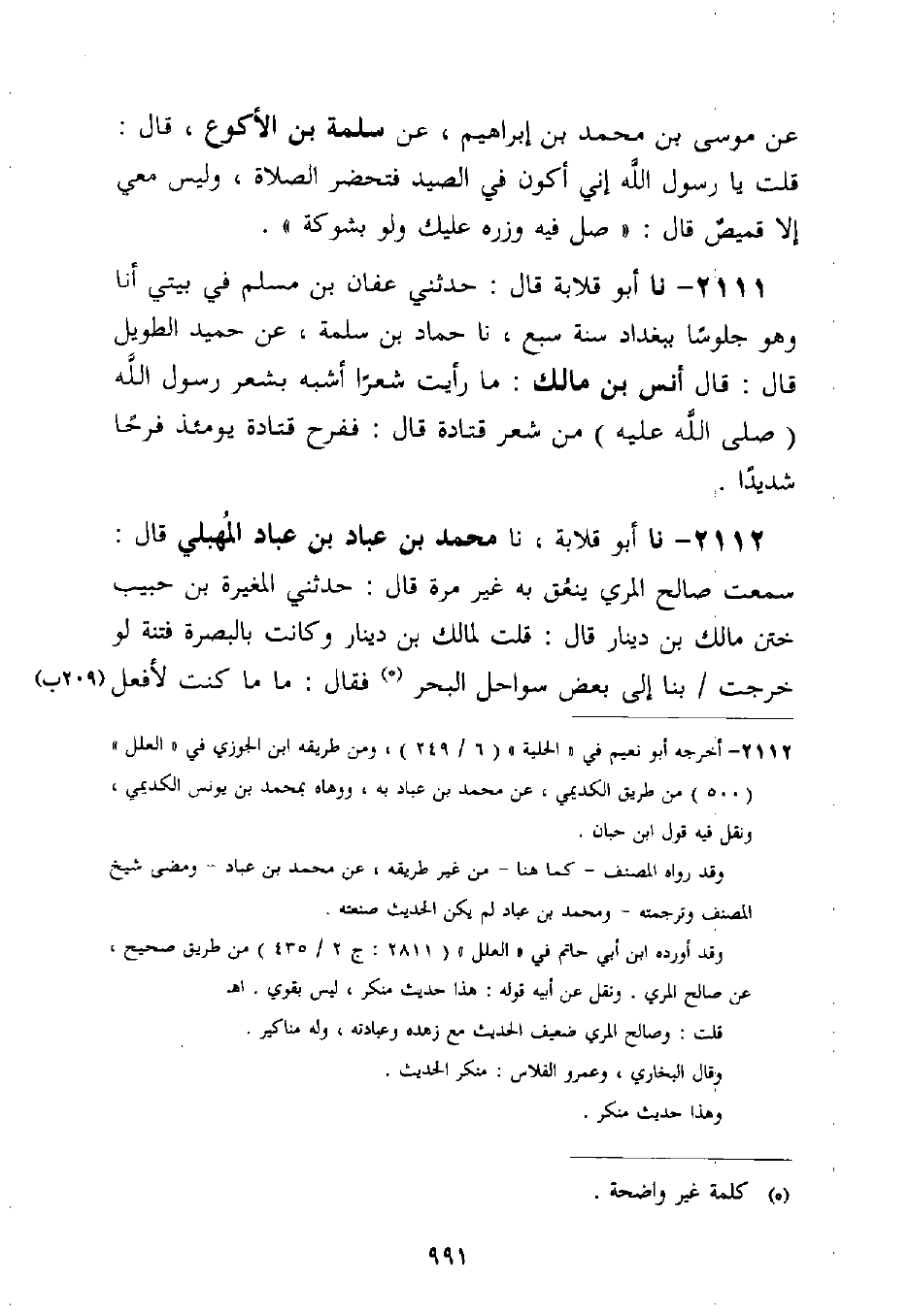 2112 - نا أَبُو قِلَابَةَ، نا مُحَمَّدُ بْنُ عَبَّادِ بْنِ عَبَّادٍ الْمُهْبَلِيُّ قَالَ: سَمِعْتُ صَالِحًا الْمُرِّيَّ، يَنْعِقُ بِهِ غَيْرَ مَرَّةٍ قَالَ: حَدَّثَنِي الْمُغِيرَةُ بْنُ حَبِيبٍ خَتَنُ مَالِكِ بْنِ دِينَارٍ قَالَ: قُلْتُ لِمَالِكِ بْنِ دِينَارٍ وَكَانَتْ بِالْبَصْرَةِ فِتْنَةٌ: لَوْ خَرَجْتَ بِنَا إِلَى بَعْضِ سَوَاحِلِ الْبَحْرِ، فَقَالَ: مَا كُنْتُ لِأَفْعَلَ -[992]- ذَاكَ، سَمِعْتُ الْأَحْنَفَ بْنَ قَيْسٍ يُحَدِّثُ قَالَ: قَالَ أَبُو ذَرٍّ: أَيْنَ مَسْكَنُكَ؟ قُلْتُ: بِالْبَصْرَةِ قَالَ: سَمِعْتُ رَسُولَ اللَّهِ صَلَّى اللَّهُ عَلَيْهِ وَسَلَّمَ يَقُولُ: §تَكُونُ بَلْدَةٌ، أَوْ قَرْيَةٌ، أَوْ مَصْرٌ، يُقَالُ لَهَا الْبَصْرَةُ، أَقَوْمُ النَّاسِ قِبَلًا، وَأَكْثَرُهُمْ مُؤَذِّنِينَ، يَدْفَعُ اللَّهُ عَنْهُمْ مَا يَكْرَهُوَنَ