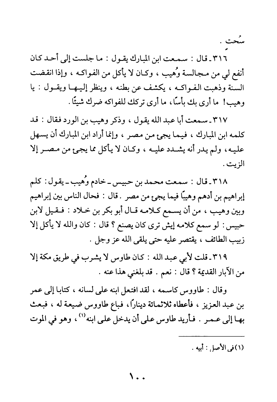 316 - قَالَ سَمِعْتُ ابْنَ الْمُبَارَكِ يَقُولُ مَا جَلَسْتُ إِلَى أَحَدٍ كَانَ أَنْفَعَ لِي مِنْ مُجَالَسَةِ وُهَيْبٍ وَكَانَ لَا يَأْكُلُ مِنَ الْفَوَاكِهِ وَإِذَا انْقَضَتِ السَّنَةُ وَذَهَبَتِ الْفَوَاكِهُ يَكْشِفُ عَنْ بَطْنِهِ وَيَنْظُرُ إِلَيْهَا وَيَقُولُ يَا وُهَيْبُ مَا أَرَى بِكَ بَأْسًا مَا أَرَى تَرْكَكَ لِلْفَوَاكِهِ ضَرَّكَ شَيْئًا