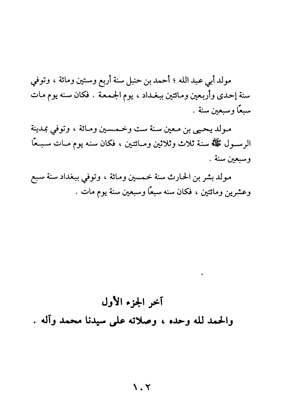 مَوْلِدُ أَبِي عَبْدِ اللَّهِ أَحْمَدَ بْنِ حَنْبَلٍ سَنَةَ أَرْبَعٍ وَسِتِّينَ وَمِائَةٍ وَتُوُفِّيَ سَنَةَ إِحْدَى وَأَرْبَعِينَ وَمِائَتَيْنِ بِبَغْدَادَ يَوْمَ الْجُمُعَةِ