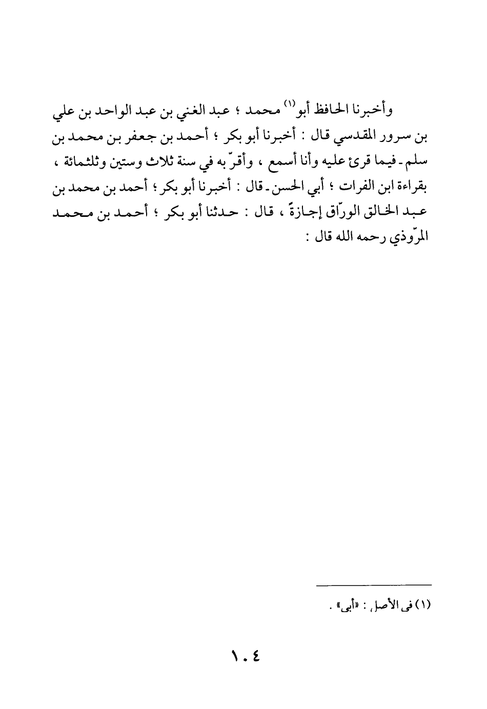 وَأخْبرنَا الْحَافِظ أَبُو مُحَمَّد عبد الْغَنِيّ بن عبد الْوَاحِد بن عَليّ بن سرُور الْمَقْدِسِي قَالَ أخبرنَا أَبُو بكر أَحْمد بن جَعْفَر بن مُحَمَّد بن سلم فِيمَا قرئَ عَلَيْهِ وَأَنا أسمع وَأقر بِهِ فِي سنة ثَلَاث وَسِتِّينَ وثلثمائة بِقِرَاءَة ابْن الْفُرَات أبي الْحسن قَالَ أخبرنَا أَبُو بكر أَحْمد بن مُحَمَّد بن عبد الْخَالِق الْوراق إجَازَة قَالَ حَدثنَا أَبُو بكر أَحْمد بن مُحَمَّد الْمَرْوذِيّ رَحمَه الله قَالَ