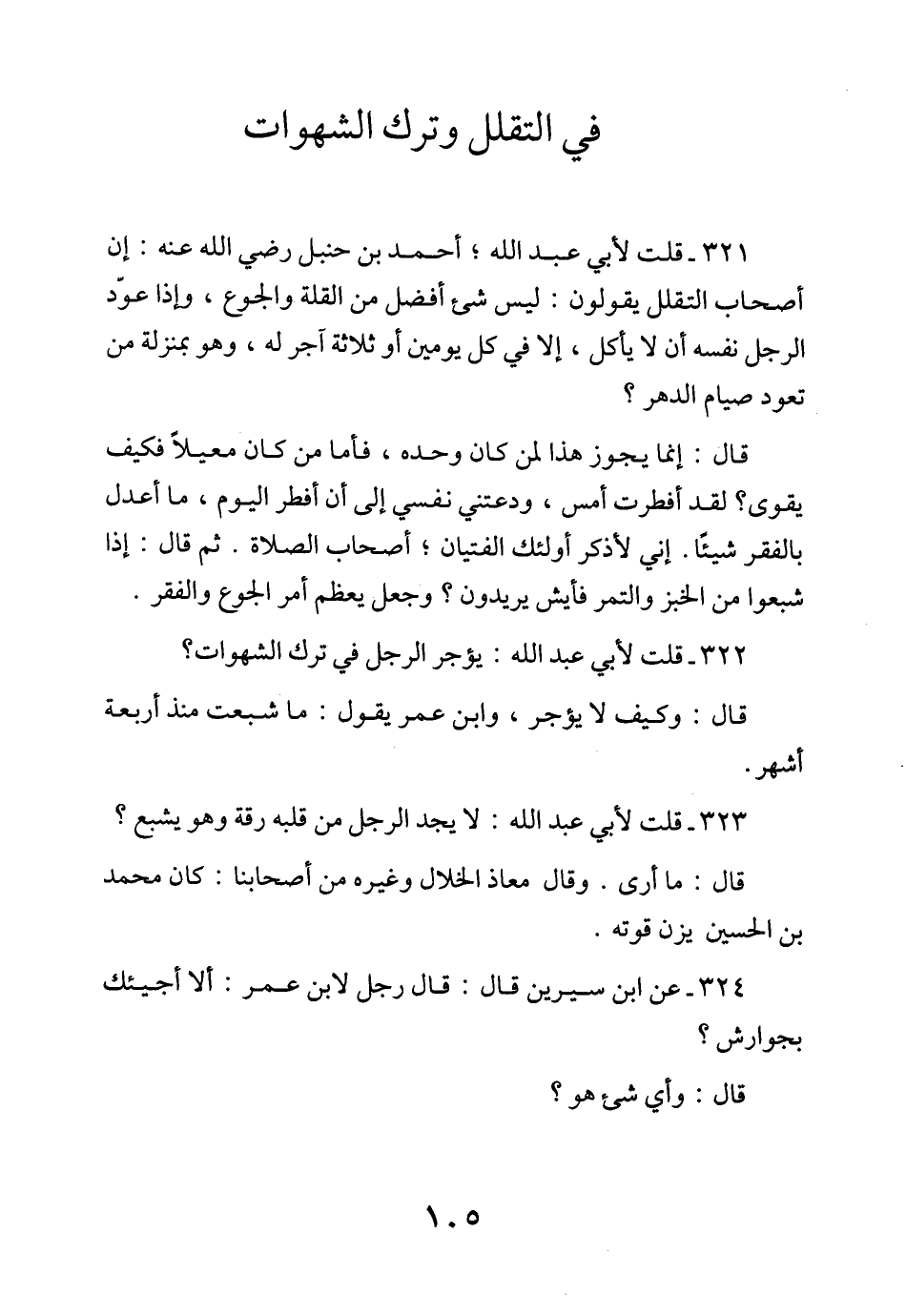 321 - قُلْتُ لِأَبِي عَبْدِ اللَّهِ أَحْمَدَ بْنِ حَنْبَلٍ رَضِيَ اللَّهُ عَنْهُ إِنَّ أَصْحَابَ التَّقَلُّلِ يَقُولُونَ لَيْسَ شَيْءٌ أَفْضَلَ مِنَ الْقِلَّةِ وَالْجُوعِ وَإِذَا عَوَّدَ الرَّجُلُ نَفْسَهُ (أَنْ لَا يَأْكُلَ، إِلَّا فِي كُلِّ يَوْمَيْنِ أَوْ ثَلاثَةٍ أُجِرَ لَهُ، وَهُوَ بِمَنْزِلَةِ مَنْ تَعَوَّدَ صِيَامَ الدَّهْرِ)