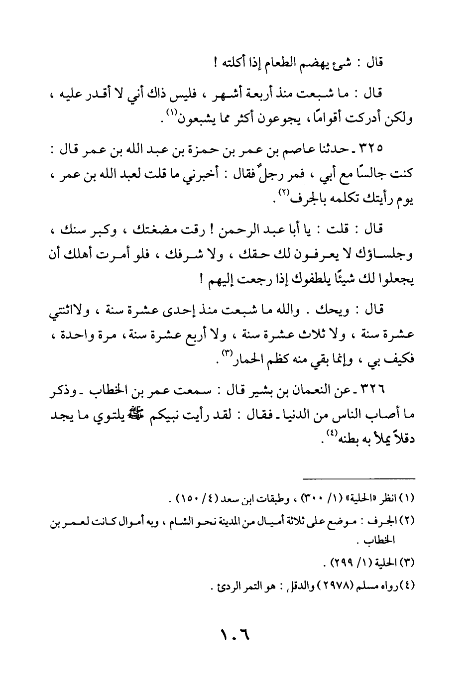 325 - حَدَّثَنَا عَاصِمُ بْنُ عُمَرَ بْنِ حَمْزَةَ بْنِ عَبْدِ اللَّهِ بْنِ عُمَرَ قَالَ كُنْتُ جَالِسًا مَعَ أَبِي فَمَرَّ رَجُلٌ فَقَالَ أَخْبِرْنِي مَا قُلْتَ لِعَبْدِ اللَّهِ بْنِ عُمَرَ يَوْمَ رَأَيْتُكَ تُكَلِّمُهُ بِالْجُرُفِ