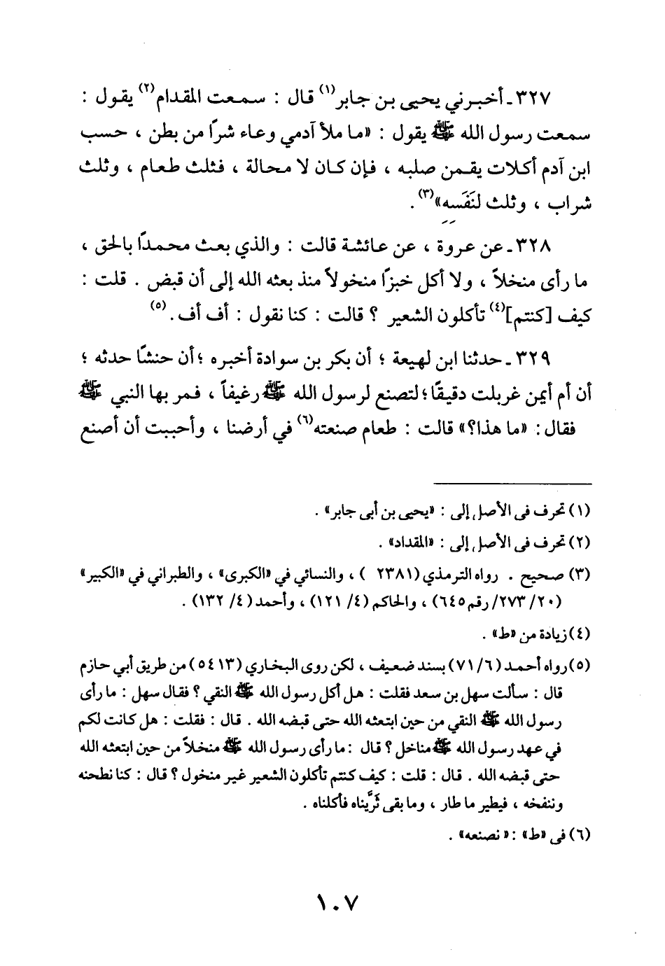 327 - أَخْبَرَنِي يَحْيَي بْنُ جَابِرٍ قَالَ سَمِعْتُ الْمِقْدَامَ يَقُولُ سَمِعْتُ رَسُولَ اللَّهِ صَلَّى اللَّهُ عَلَيْهِ وَسَلَّمَ يَقُولُ مَا مَلَأَ آدَمِيٌّ وِعَاءً شَرًّا مِنْ بَطْنٍ حَسْبُ ابْنِ آدَمَ أُكُلاتٍ يُقِمْنَ صُلْبَهُ فَإِنْ كَانَ لَا مَحَالَةَ فَثُلُثٌ طَعَامٌ وَثُلُثٌ شَرَابٌ وَثُلُثٌ لِنَفَسِهِ