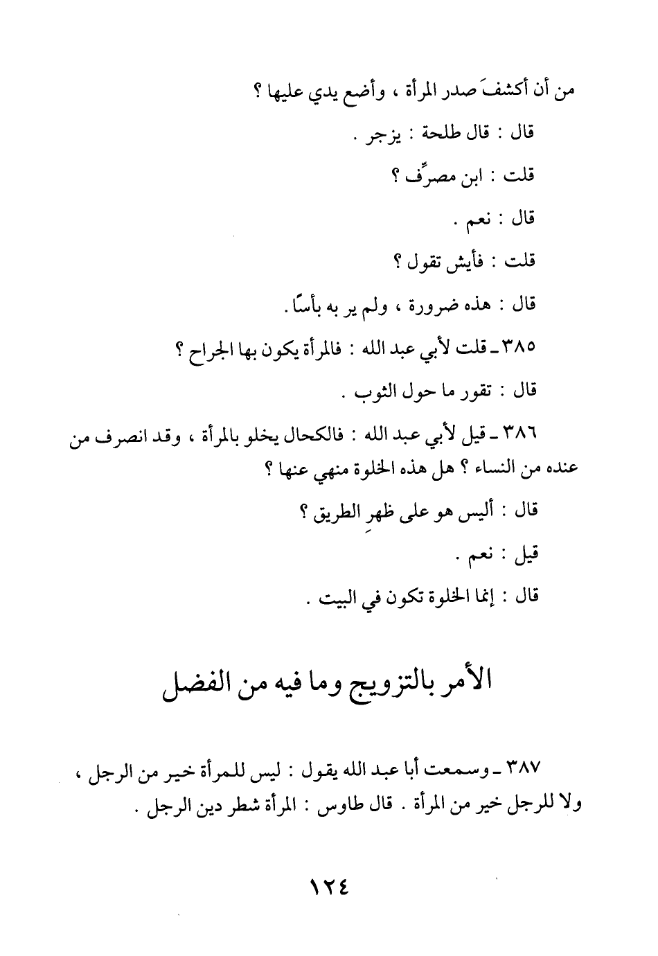 386 - قِيلَ لِأَبِي عَبْدِ اللَّهِ فَالْكَحَّالُ يَخْلُو بِالْمَرْأَةِ وَقَدِ انْصَرَفَ مَنْ عِنْد مِنَ النِّسَاءِ هَلْ هَذِهِ الْخُلْوَةُ مَنْهِيٌّ عَنْهَا