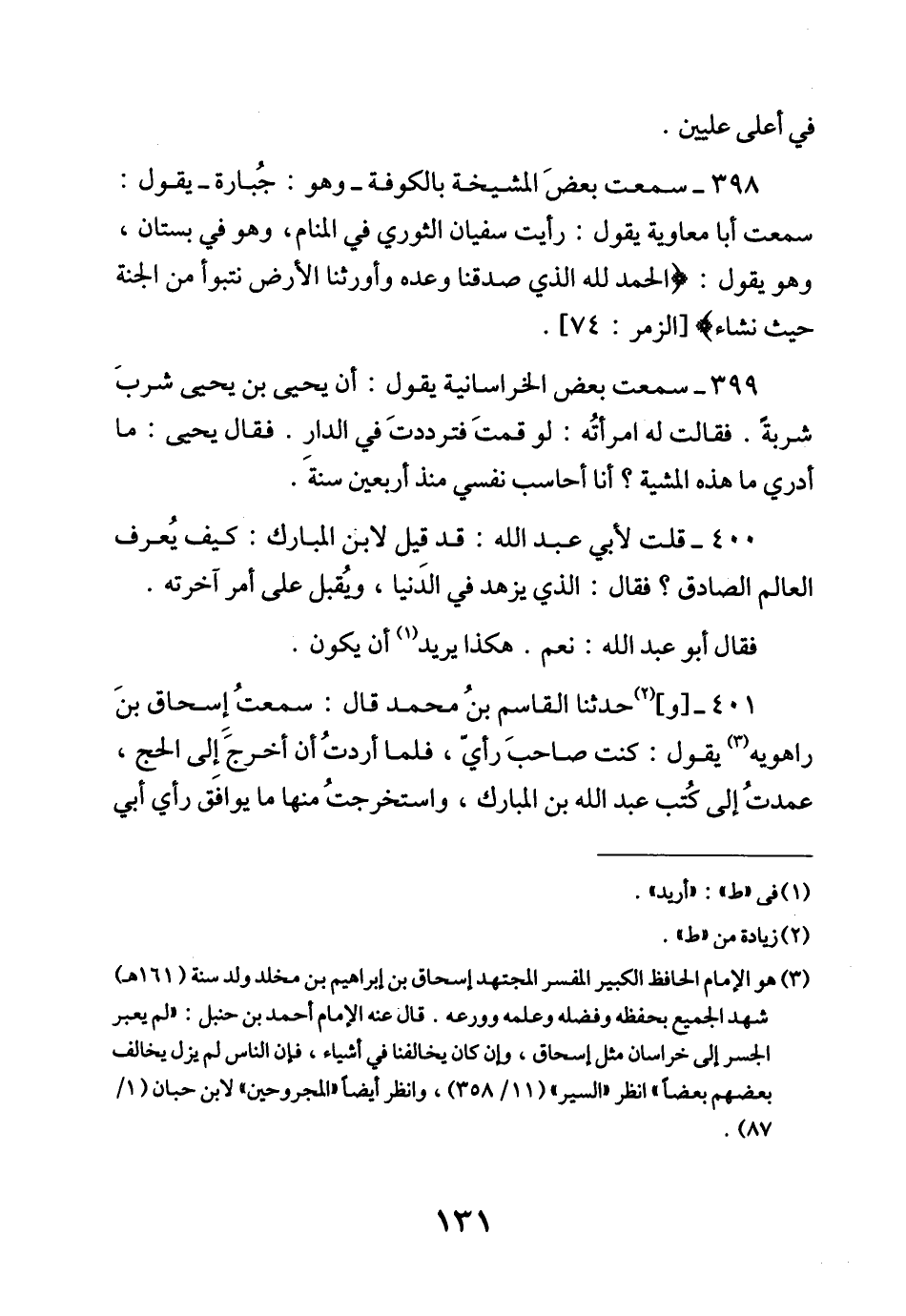 400 - قُلْتُ لِأَبِي عَبْدِ اللَّهِ قَدْ قِيلَ لِابْنِ الْمُبَارَكِ كَيْفَ يُعْرَفُ الْعَالِمُ الصَّادِقُ فَقَالَ الَّذِي يَزْهَدُ فِي الدُّنْيَا وَيُقْبِلُ عَلَى أَمْرِ آخِرَتِهِ