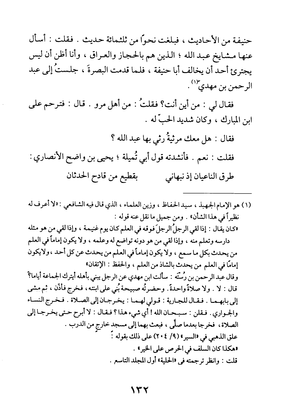 فَقُلْتُ أَسْأَلُ عَنْهَا مَشَايِخَ عَبْدِ اللَّهِ الَّذِينَ هُمْ بِالْحِجَازِ وَالْعِرَاقِ وَأَنَا أَظُنُّ أَنْ لَيْسَ يَجْتَرِئَ أَحَدٌ أَنْ يُخَالِفَ أَبَا حَنِيفَةَ فَلَمَّا قَدِمْتُ الْبَصْرَةَ جَلَسْتُ إِلَى عَبْدِ الرَّحْمَنِ بْنِ مَهْدِيٍّ