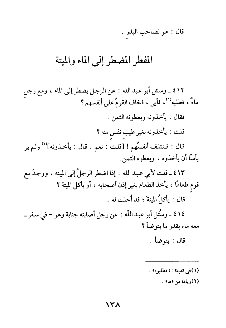 412 - وَسُئِلَ أَبُو عَبْدِ اللَّهِ عَنِ الرَّجُلِ يُضْطَرُّ إِلَى الْمَاءِ وَمَعَ رَجُلٍ مَاءٌ فَطَلَبَهُ فَأَبَى فَخَافَ الْقَوْمُ عَلَى أَنْفُسِهِمْ