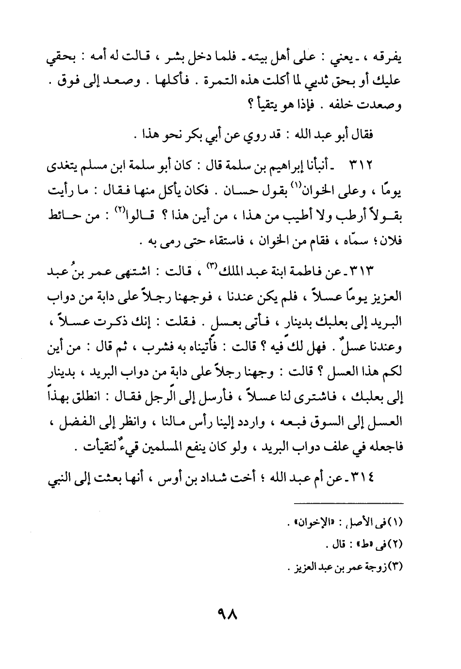 313 - عَنْ فَاطِمَةَ ابْنَةِ عَبْدِ الْمَلِكِ قَالَتْ اشْتَهَى عُمَرُ بْنُ عَبْدِ الْعَزِيزِ يَوْمًا عَسَلًا فَلَمْ يَكُنْ عِنْدَنَا فَوَجَّهْنَا رَجُلًا عَلَى دَابَّةٍ مِنْ دَوَابِّ الْبَرِيدِ إِلَى بَعْلَبَكَّ بِدِينَارٍ فَأَتَى بِعَسَلٍ