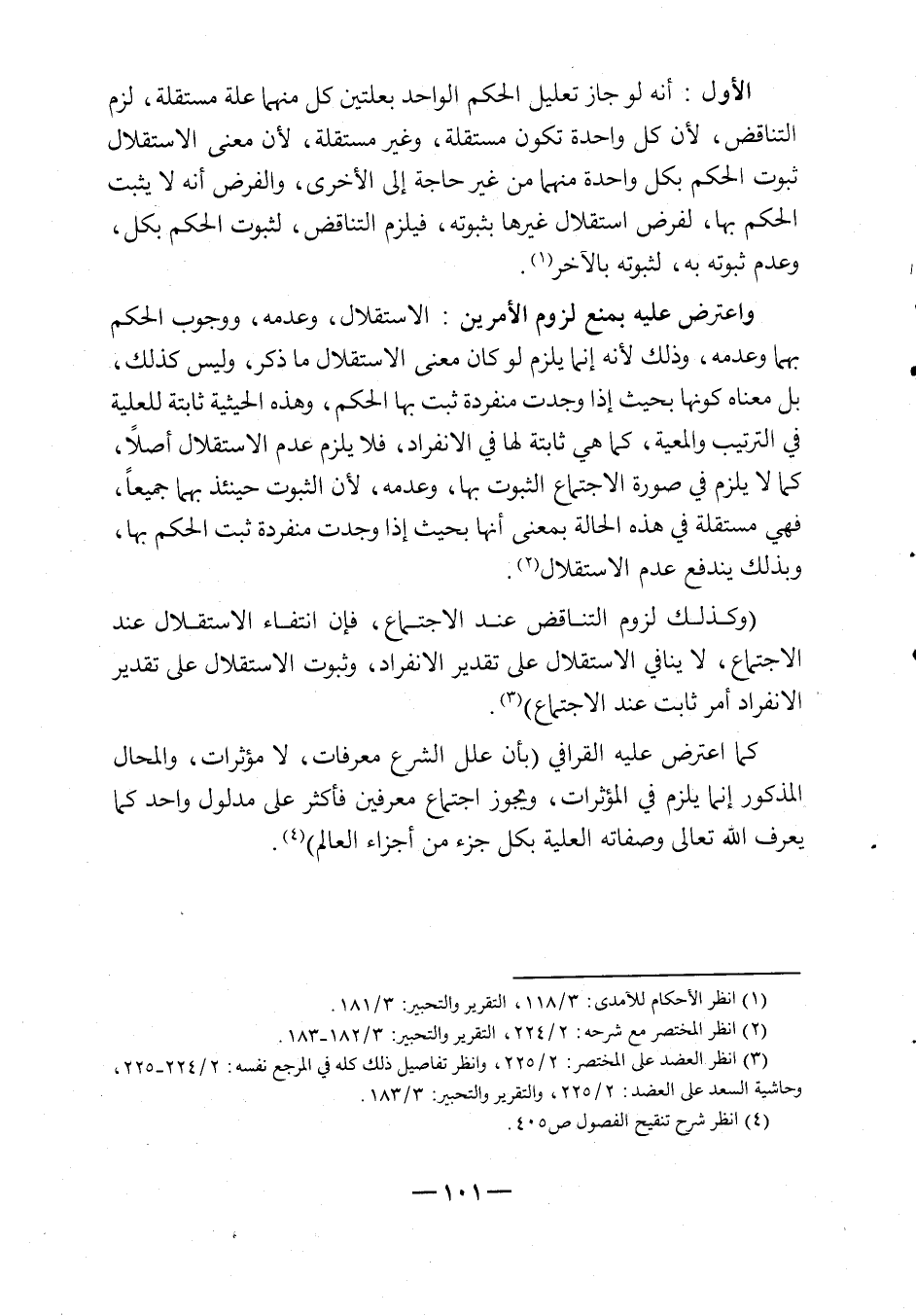 واعترض عليه بمنع لزوم الأمرين: الاستقلال، وعدمه، ووجوب الحكم بهما وعدمه، وذلك لأنه إنما يلزم لو كان معنى الاستقلال ما ذكر، وليس كذلك، بل معناه كونها بحيث إذا وجدت منفردة ثبت بها الحكم، وهذه الحيثية ثابتة للعلية في الترتيب والمعية، كما هي ثابتة لها في الانفراد، فلا يلزم عدم الاستقلال أصلاً، كما لا يلزم في صورة الاجتماع الثبوت بها، وعدمه، لأن الثبوت حينئذ بهما جميعاً، فهي مستقلة في هذه الحالة بمعنى أنها بحيث إذا وجدت منفردة ثبت الحكم بها، وبذلك يندفع عدم الاستقلال2.