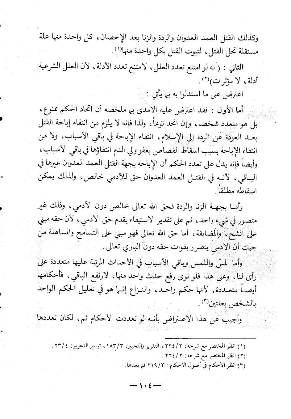 أما الأول: فقد اعترض عليه الآمدي بما ملخصه أن اتحاد الحكم ممنوع، بل هو متعدد شخصاً، وإن اتحد نوعاً، ولذا فإنه لا يلزم من انتفاء إباحة القتل بعد العودة عن الردة إلى الإسلام، انتفاء الإباحة في باقي الأسباب، ولا من انتفاء الإباحة بسبب إسقاط القصاص بعفو ولي الدم انتفاؤها في باقي الأسباب، وأيضاً فإنه بدل على تعدد الحكم أن الإباحة بجهة القتل العمد العدوان غيرها في الباقي، لأنها في القتل العمد العدوان حق للآدمي خالص، ولذلك يمكن إسقاطه مطلقاً.