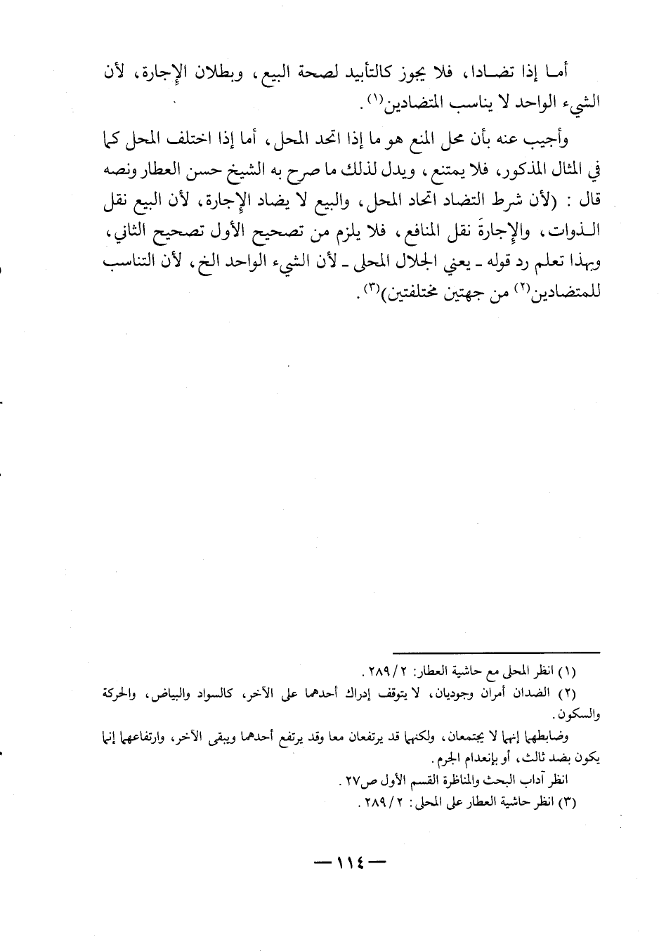 وأجيب عنه بأن محل المنع هو ما إذا اتحد المحل، أما إذا اختلف المحل كما في المثال المذكور، فلا يمتنع، ويدل لذلك ما صرح به الشيخ حسن العطار ونصه قال: "لأن شرط التضاد اتحاد المحل، والبيع لا يضاد الإجارة، لأن البيع نقل الذوات، والإجارة نقل المنافع، فلا يلزم من تصحيح الأول تصحيح الثاني، وبهذا تعلم رد قوله - يعني الجلال المحلى - لأن الشيء الواحد الخ، لأن التناسب للمتاضدين2 من جهتين مختلفتين"3.