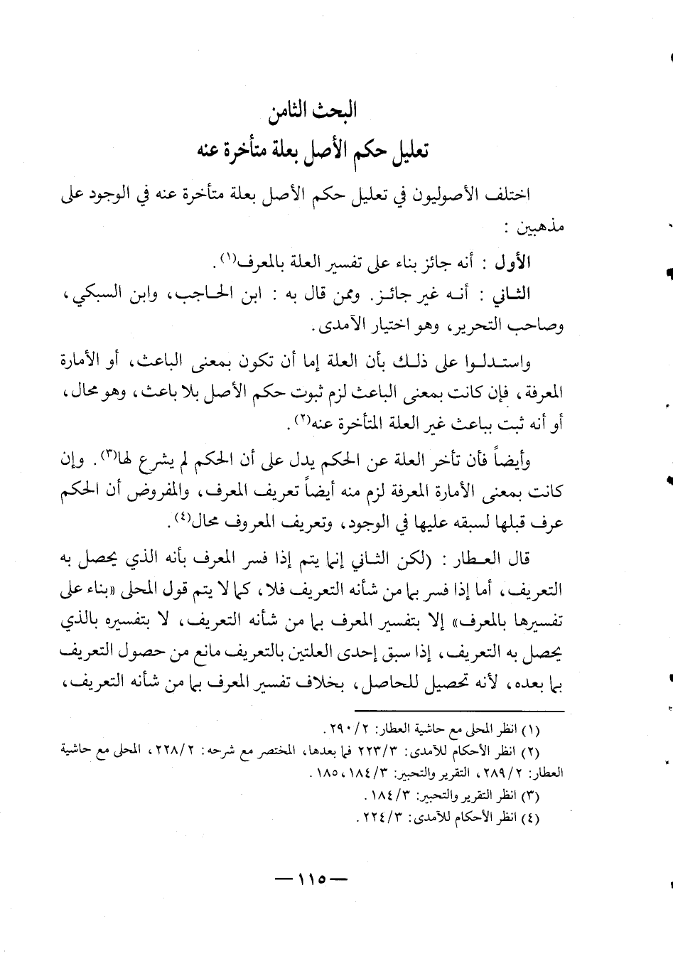 وأيضاً فإن تأخر العلة عن الحكم يدل على أن الحكم لم يشرع لها3، وإن كانت بمعنى الأمارة المعرفة لزم منه أيضاً تعريف المعرف، والمفروض أن الحكم عرف قبلها لسبقه عليها في الوجود، وتعريف المعرف ومحال4.