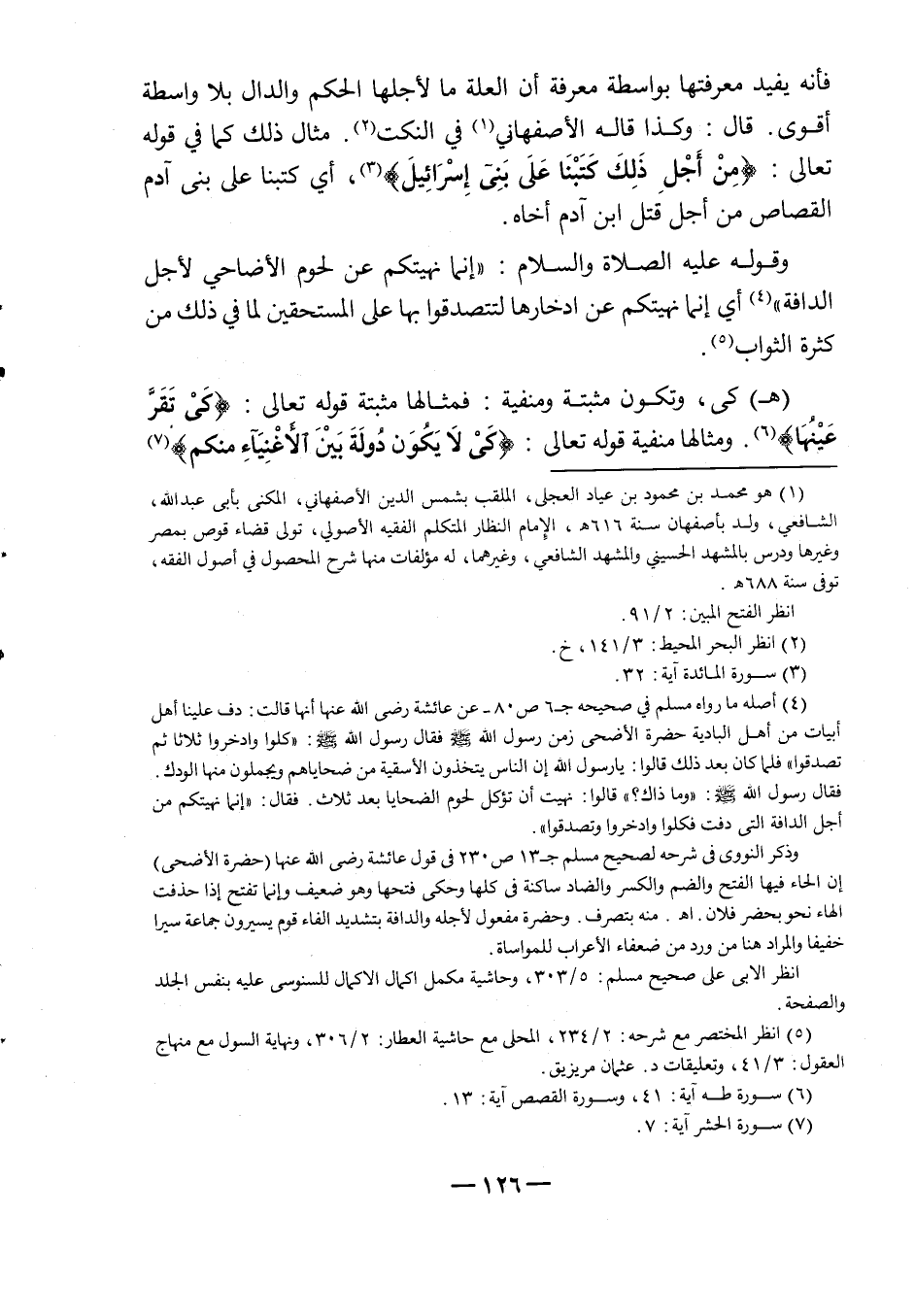 فإنه يفيد معرفتها بواسطة معرفة أن العلة ما لأجلها الحكم والدال بلا واسطة أقوى. قال: وكذا قاله الأصفهاني1 في النكت2، مثال ذلك كما في قوله تعالى: {مِنْ أَجْلِ ذَلِكَ كَتَبْنَا عَلَى بَنِي إِسْرَائِيلَ} 3، أي كتبنا على بني آدم القصاص من أجل قتل ابن آدم أخاه.