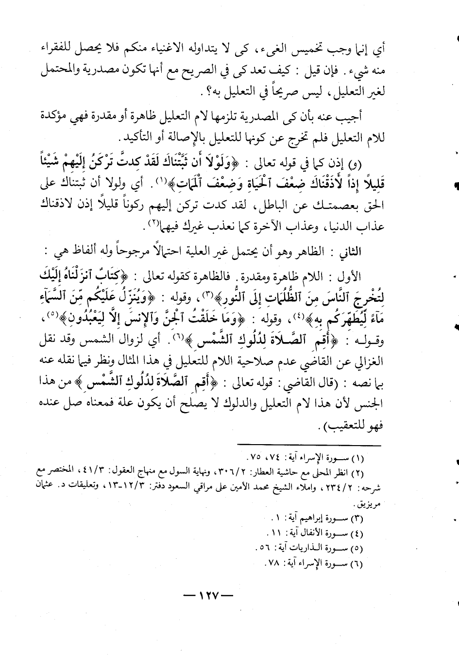 الأول: اللام ظاهرة ومقدرة، فالظاهر كقوله تعالى: {كِتَابٌ أَنزَلْنَاهُ إِلَيْكَ لِتُخْرِجَ النَّاسَ مِنَ الظُّلُمَاتِ إِلَى النُّورِ} 3، وقوله تعالى: {وَيُنَزِّلُ عَلَيْكُم مِّن السَّمَاء مَاء لِّيُطَهِّرَكُم بِهِ} 4، وقوله: {وَمَا خَلَقْتُ الْجِنَّ وَالإِنسَ إِلاَّ لِيَعْبُدُونِ} 5، وقوله: {أَقِمِ الصَّلاَةَ لِدُلُوكِ الشَّمْسِ} 6، أي لزوال الشمس، وقد نقل الغزالي عن القاضي عدم صلاحية اللام للتعليل في هذا المثال ونظر فيما نقله عنه بما نصه: "قال القاضي: قوله تعالى: {أَقِمِ الصَّلاَةَ لِدُلُوكِ الشَّمْسِ} من هذا الجنس لأن هذا لام التعليل والدلوك لا يصلح أن يكون علة، فمعناه صل عنده فهو للتعقيب".