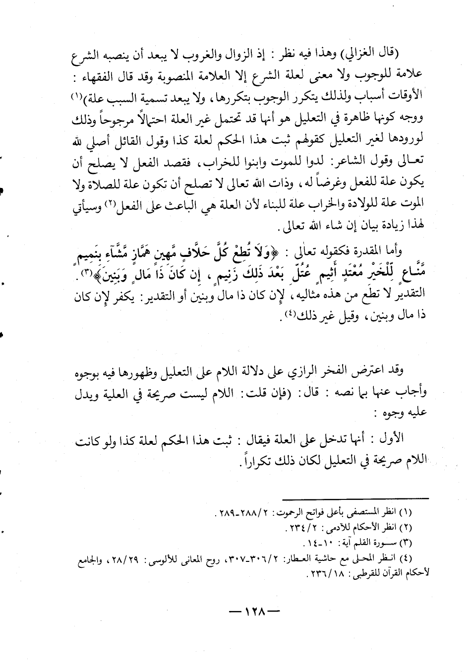 وقد اعترض الفخر الرازي على دلالة اللام على التعليل وظهورها فيه بوجوه، وأجاب عنها بما نصه: قال: "فإن قلت: اللام ليست صريحة في العلية، ويدل عليه وجوه: