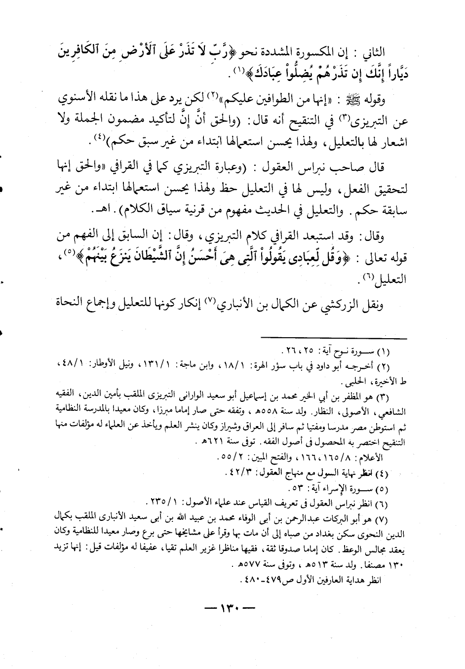 وقوله صلى الله عليه وسلم: "إنها من الطوافين عليكم" 2 لكن يرد على هذا ما نقله الأسنوي عن التبريزي3 في التنقيح، أنه قال: "والحق أن إنّ لتأكيد مضمون الجملة ولا إشعار لها بالتعليل، ولهذا يحسن استعمالها ابتداء من غير سبق حكم"4.