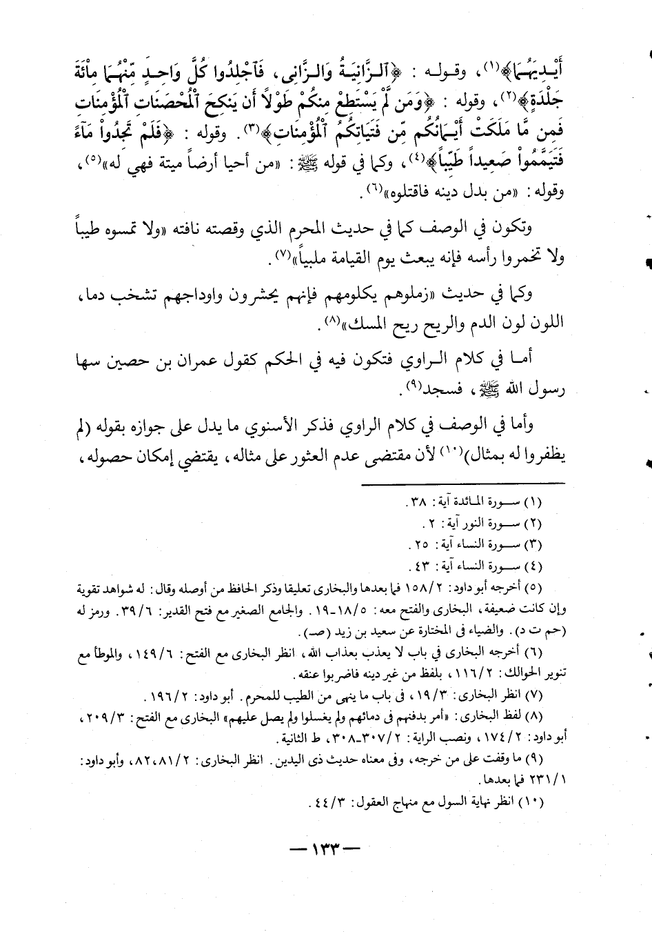 أَيْدِيَهُمَا} 1، وقوله: {الزَّانِيَةُ وَالزَّانِي فَاجْلِدُوا كُلَّ وَاحِدٍ مِّنْهُمَا مِئَةَ جَلْدَةٍ} 2، وقوله: {وَمَن لَّمْ يَسْتَطِعْ مِنكُمْ طَوْلاً أَن يَنكِح الْمُحْصَنَاتِ الْمُؤْمِنَاتِ فَمِن مِّا مَلَكَتْ أَيْمَانُكُم مِّن فَتَيَاتِكُمُ الْمُؤْمِنَاتِ} 3، وقوله: {فَلَمْ تَجِدُواْ مَاءً فَتَيَمَّمُواْ صَعِيدًا طَيِّبًا} 4، وكما في قوله صلى الله عليه وسلم: "من أحيا أرضاً ميتة، فهي له" 5، وقوله: "من بدل دينه فاقتلوه" 6.