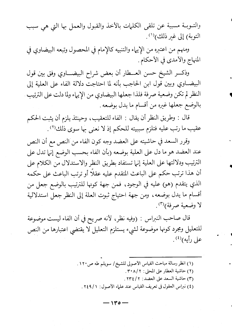 وقرر السعد في حاشيته على العضد وجه كون الفاء من النص مع أن النص عند العضد هو ما دل على العلية بوضعه "بأن الفاء بحسب الوضع إنما تدل على الترتيب ودلالتها على العلية إنما تستفاد بطريق النظر والاستدلال من الكلام على أن هذا ترتب حكم على الباعث المتقدم عليه عقلاً أو ترتب الباعث على حكمه الذي يتقدم "هو" عليه في الوجود، فمن جهة كونها للترتيب بالوضع جعل من أقسام ما يدل بوضعه، ومن جهة احتياج ثبوت العلة إلى النظر جعل استدلالية لا وضعية صرفة"3.