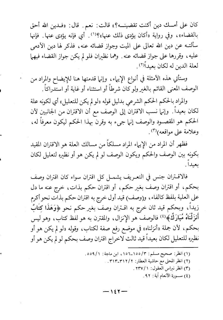فالاقتران جنس في التعريف يشمل كل اقتران سواء كان اقتران وصف بحكم، أو اقتران وصف بغير حكم، أو اقتران حكم بذات، خرج عنه ما دل على العلية بلفظ كالفاء، و "وصف" قيد أول خرج به اقتران حكم بذات نحو أكرم زيداً، وبحكم قيد ثان خرج به اقتران وصف بغير حكم نحو: {وَهَذَا كِتَابٌ أَنزَلْنَاهُ مُبَارَكٌ} 4 فالوصف هو الإنزال، والمقترن به هو لفظ كتاب، وهو ليس بحكم، لأن جملة "أنزلناه" في موضع رفع صفة لكتاب، وقوله "لو لم يكن هو أو نظيره للتعليل لكان بعيداً قيد ثالث لإخراج اقتران وصف بحكم لو لم يكن هو أو