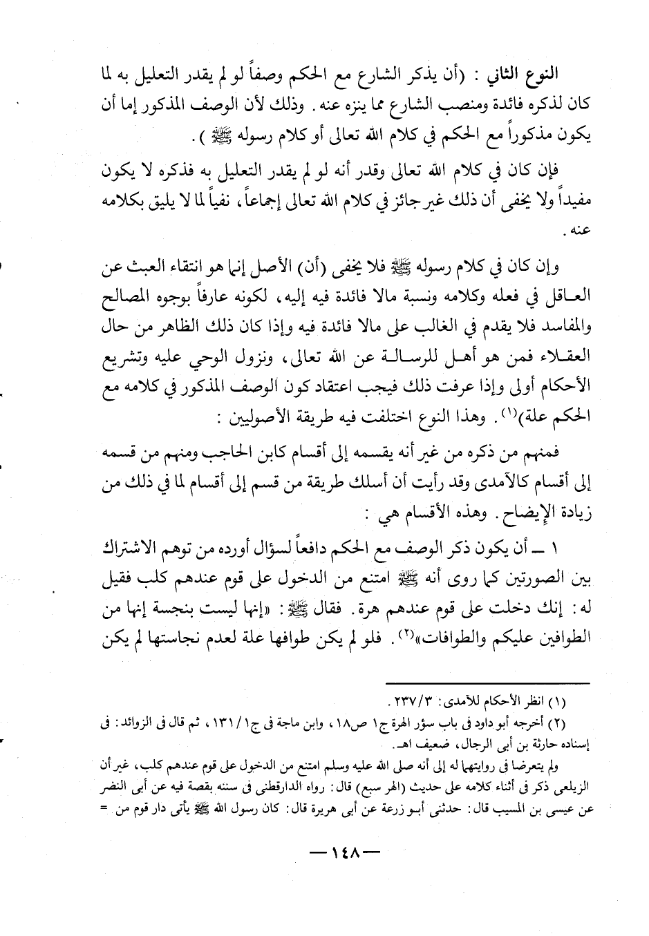 1 - أن يكون ذكر الوصف مع الحكم دافعاً لسؤال أورده من توهم الاشتراك بين الصورتين كما روي أنه صلى الله عليه وسلم امتنع من الدخول على قوم عندهم كلب، فقيل له: إنك دخلت على قوم عندهم هرة، فقال صلى الله عليه وسلم: "إنها ليست نجسة، إنها من الطوافين عليكم والطوافات" 2، فلو لو يكن طوافها علة لعدم نجاستها لم يكن