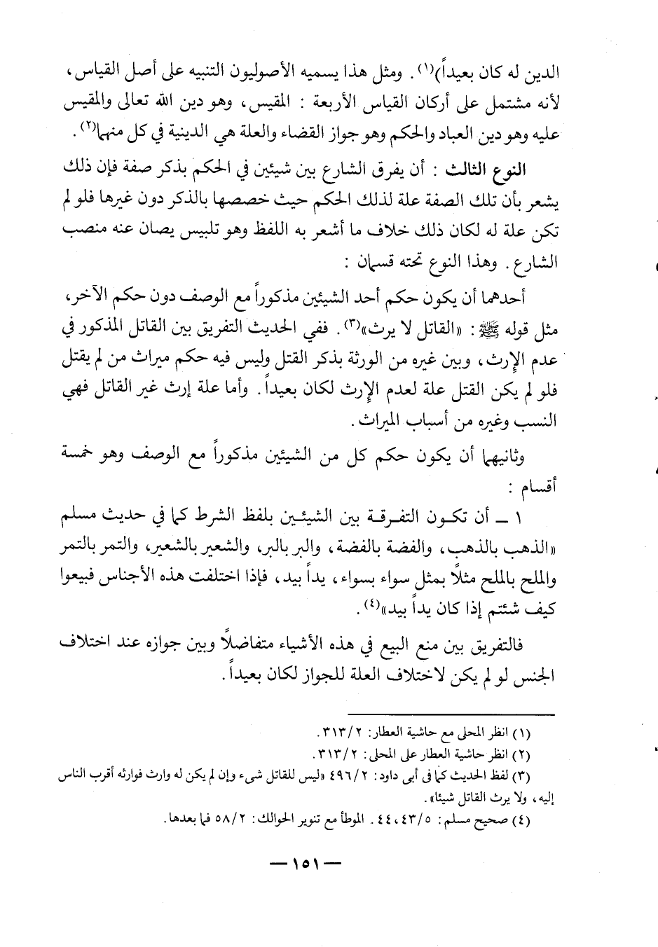 أحدهما: أن يكون حكم أحد الشيئين مذكوراً مع الوصف دون حكم الآخر، مثل قوله صلى الله عليه وسلم: "القاتل لا يرث" 3، ففي الحديث التفريق بين القاتل المذكور في عدم الإرث، وبين غيره من الورثة بذكر القتل، وليس فيه حكم ميراث من لم يقتل، فلو لم يكن القتل عله لعدم الإرث لكان بعيداً، وأما علة إرث غير القاتل فهي النسب وغيره من أسباب الميراث.