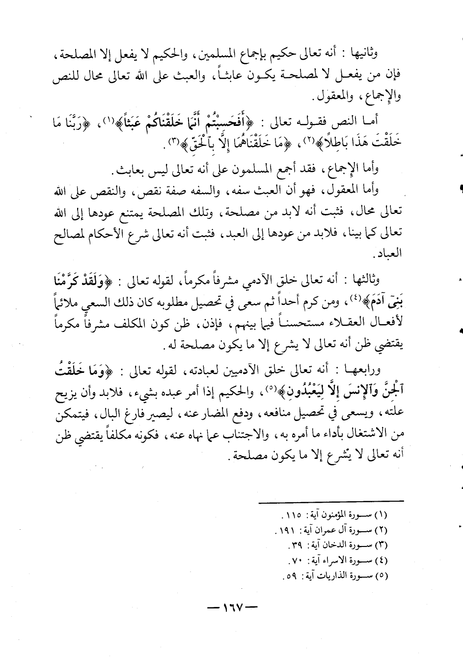 وأما النص، فقوله تعالى: {أَفَحَسِبْتُمْ أَنَّمَا خَلَقْنَاكُمْ عَبَثًا} 1، {رَبَّنَا مَا خَلَقْتَ هَذا بَاطِلاً} 2، {مَا خَلَقْنَاهُمَا إِلاَّ بِالْحَقِّ} 3.