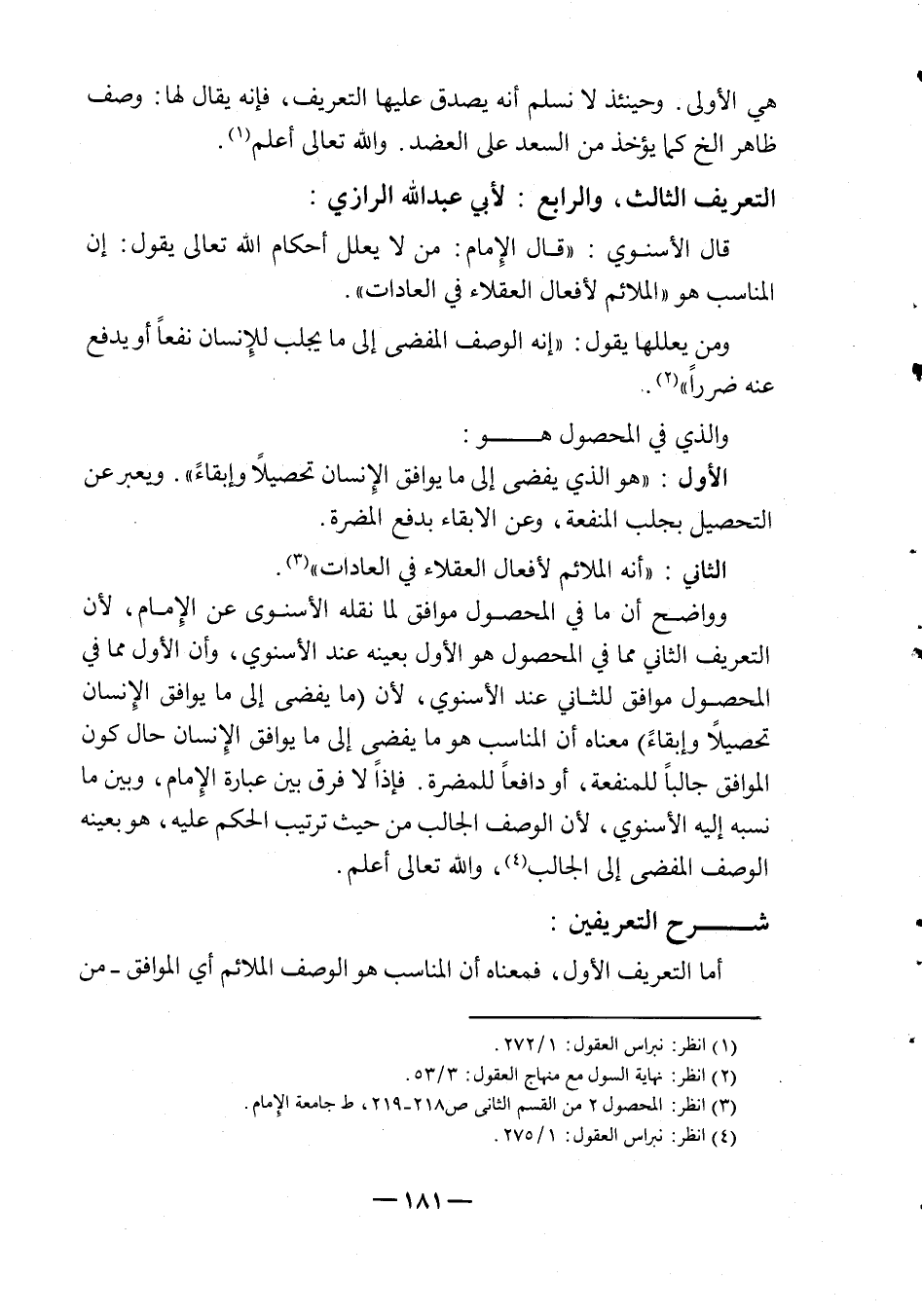 وواضح أن ما في المحصول موافق لما نقله الأسنوي عن الإمام، لأن التعريف الثاني مما في المحصول هو الأول بعينه عند الأسنوي، وأن الأول مما في المحصول موافق للثاني عند الأسنوي، لأن "ما يفضي إلى ما يوافق الإنسان تحصيلاً وإبقاءً" معناه أن المناسب هو ما يفضي إلى ما يوافق الإنسان حال كون الموافق جالباً للمنفعة، أو دافعاً للمضرة، فإذاً لا فرق بين عبارة الإمام، وبين ما نسبه إليه الأسنوي، لأن الوصف الجالب من حيث ترتيب الحكم عليه، هو بعينه الوصف المفضي إلى الجالب4، والله تعالى أعلم.