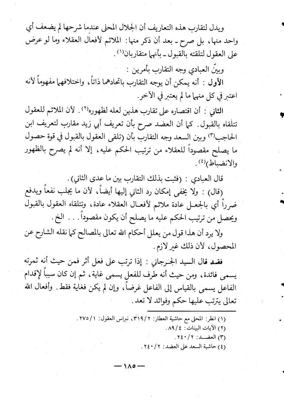 الثاني: أن اقتصاره على تقارب هذين لعله لظهوره2، لأن الملائم للعقول تتلقاه بالقبول، كما أن العضد صرح بأن تعريف أبي زيد مقارب لتعريف ابن الحاجب3، وبين السعد وجه التقارب بأن "تلقى العقول بالقبول في قوة حصول ما يصلح مقصوداً للعقلاء من ترتيب الحكم عليه، إلا انه لم يصرح بالظهور والانضباط"4.