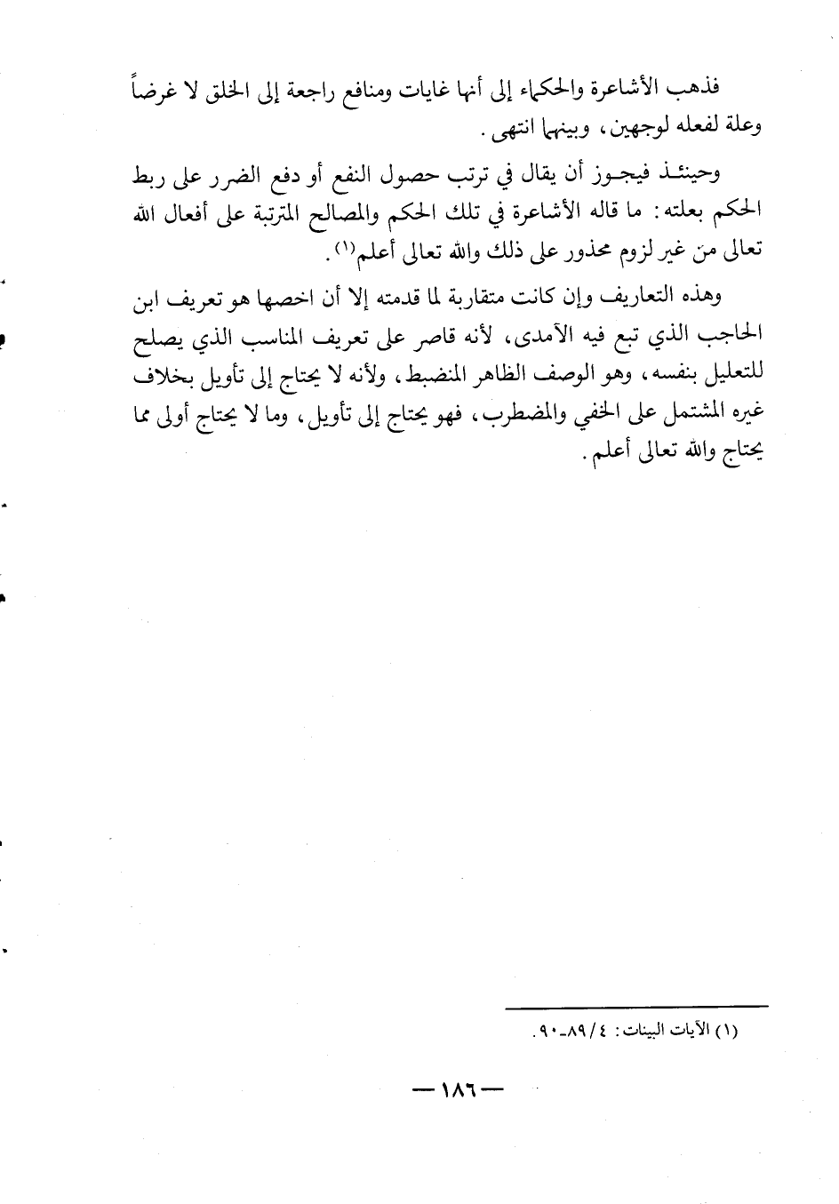 وحينئذ فيجوز أن يقال في ترتب حصول النفع أو دفع الضرر على ربط الحكم بعلته: ما قاله الأشاعرة في تلك الحكم والمصالح المترتبة على أفعال الله تعالى من غير لزوم محذور على ذلك، والله تعالى أعلم1.