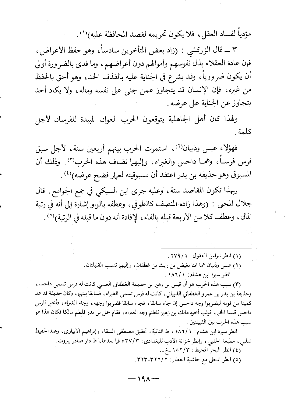3 - قال الزركشي: "زاد بعض المتأخرين سادساً، وهو حفظ الأعراض، فإن عادة العقلاء بذل نفوسهم وأموالهم دون أعراضهم، وما فدي بالضرورة أولى أن يكون ضرورياً، وقد يشرع في الجناية عليه بالقذف الحد، وهو أحق بالحفظ من غيره، فإن الإنسان قد يتجاوز عمن جنى على نفسه وماله، ولا يكاد أحد يتجاور عن الجناية على عرضه.