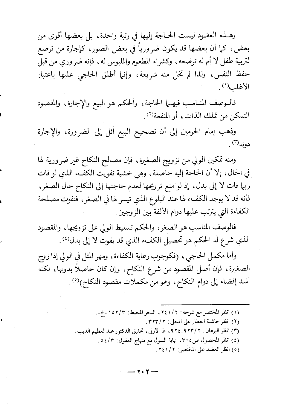 ومنه تمكين الولي من تزويج الصغيرة، فإن مصالح النكاح غير ضرورية لها في الحال، إلا أن الحاجة إليه حاصلة، وهي خشية تفويت الكفء الذي لو فات ربما فات لا إلى بدل، إذ لو منع تزويجها لعدم حاجتها إلى النكاح حال الصغر، فإنه قد لا يوجد الكفء لها عند البلوغ الذي تيسر لها في الصغر، فتفوت مصلحة الكفاءة التي يترتب عليها دوام الألفة بين الزوجين.