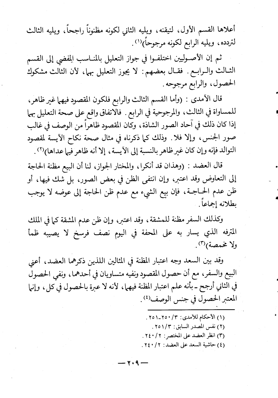 قال الآمدي: "وأما القسم الثالث والرابع فلكون المقصود فيهما غير ظاهر، للمساواة في الثالث، والمرجوحية في الرابع، فالاتفاق واقع على صحة التعليل بهما إذا كان ذلك في آحاد الصور الشاذة، وكان المقصود ظاهراً من الوصف في غالب صور الجنس، وإلا فلا، وذلك كما ذكرناه في مثال صحة نكاح الآيسة لمقصود التوالد، فإنه وإن كان غير ظاهر بالنسبة إلى الآيسة، إلا أنه ظاهر فيما عداها"2.