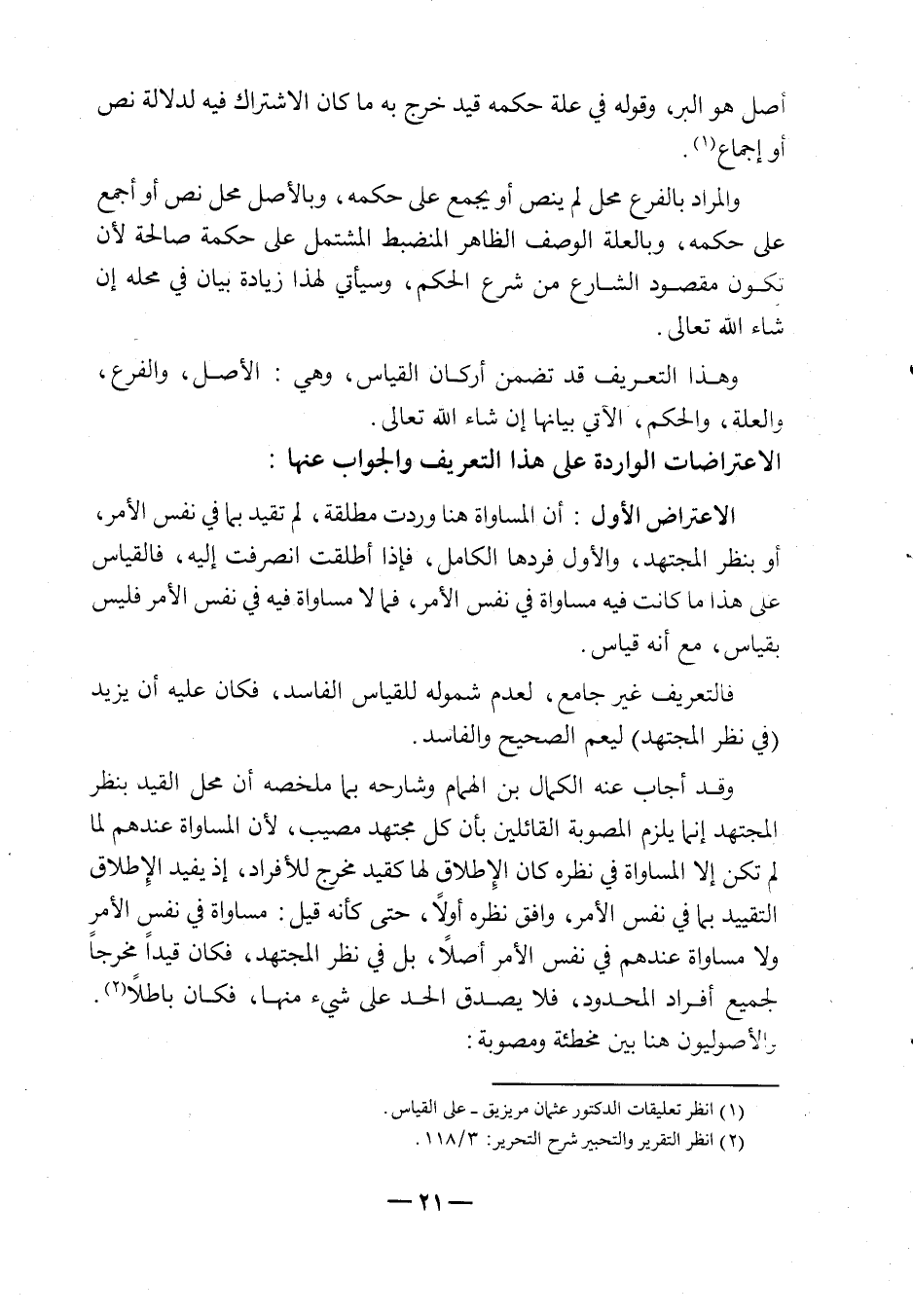 وقد أجاب عنه الكمال بن الهمام وشارحه بما ملخصه أن محل القيد بنظر المجتهد إنما يلزم المصوبة القائلين بأن كل مجتهد مصيب، لأن المساواة عندهم لما لم تكن إلا المساواة في نظره، كان الإطلاق لها كقيد مخرج للأفراد، إذ يفيد الإطلاق التقييد بما في نفس الأمر، وافق نظره أولاً، حتى كأنه قيل: مساواة في نفس الأمر، ولا مساواة عندهم في نفس الأمر أصلاً، بل في نظر المجتهد، فكان قيداً مخرجاً لجميع أفراد المحدود، فلا يصدق الحد على شيء منها، فكان باطلاً2.