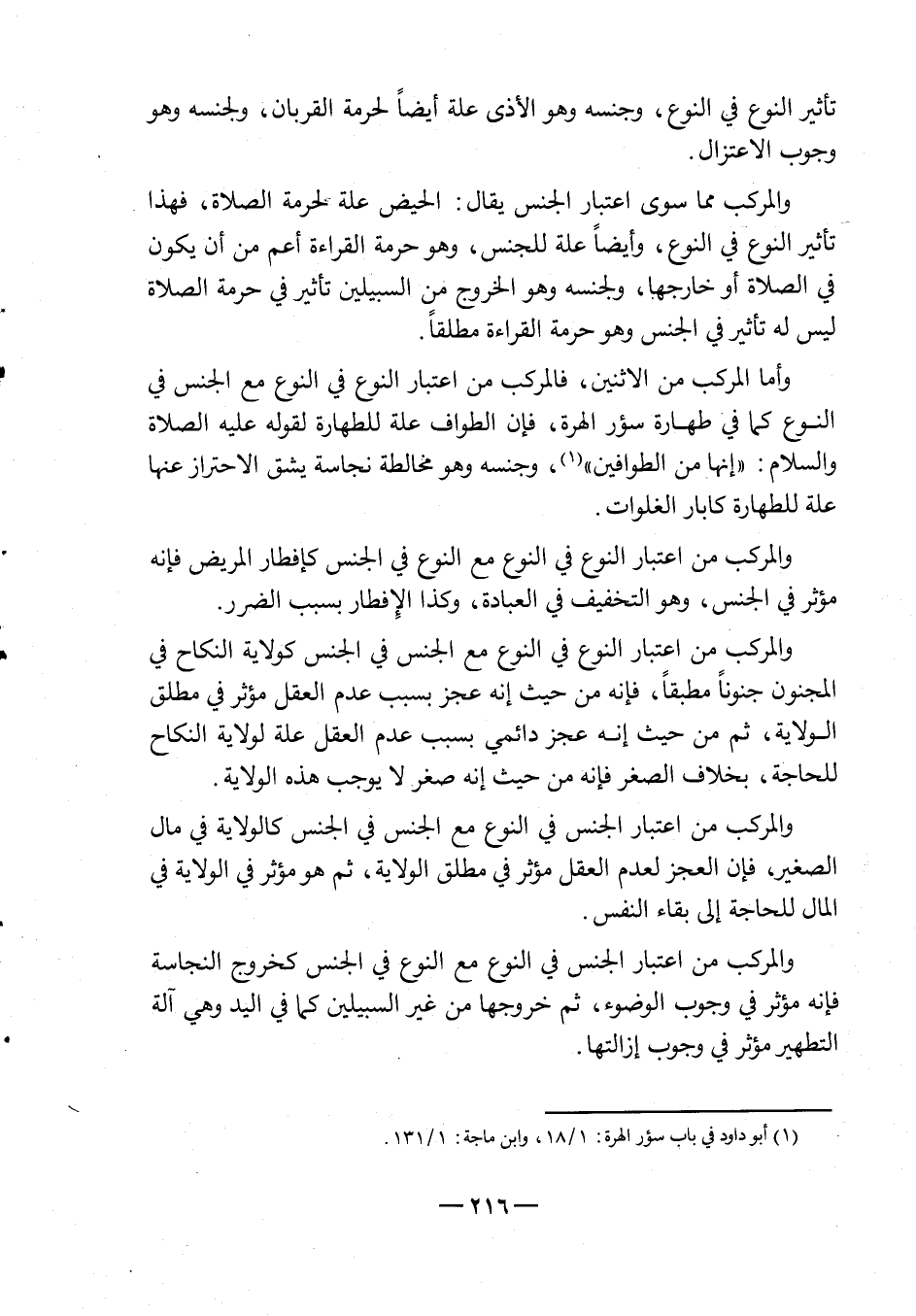 والمركب مما سوى اعتبار الجنس يقال: الحيض علة لحرمة الصلاة، فهذا تأثير النوع في النوع، وأيضاً علة للجنس، وهو حرمة القراءة أعم من أن يكون في الصلاة أو خارجها، ولجنسه وهو الخروج من السبيلين تأثير في حرمة الصلاة ليس له تأثير في الجنس، وهو حرمة القراءة مطلقاً.
