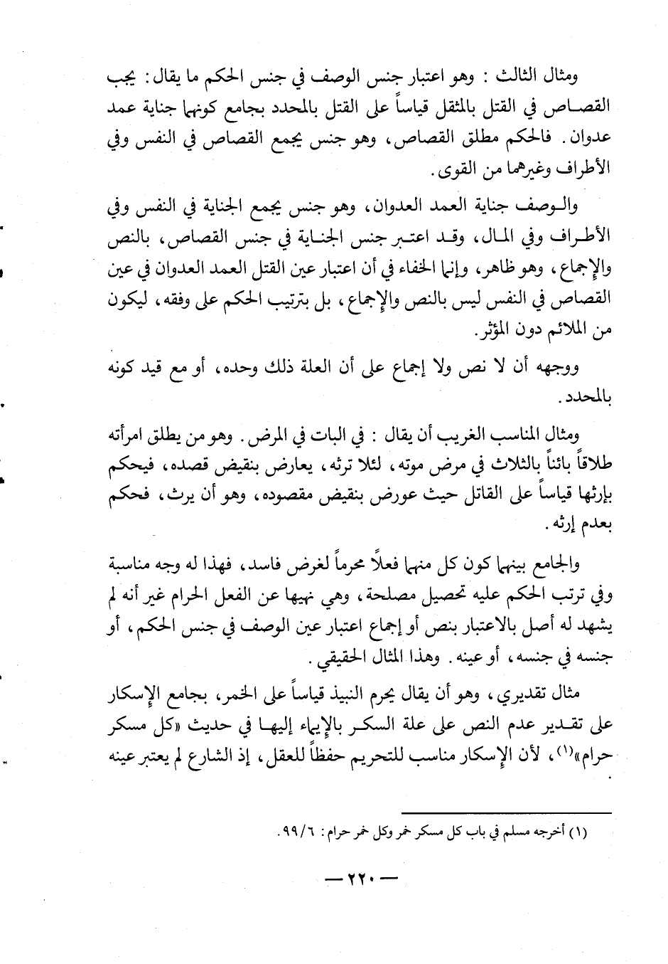 ومثال الثالث: وهو اعتبار جنس الوصف في جنس الحكم ما يقال: يجب القصاص في القتل بالمثقل قياساًَ على القتل بالمحدد بجامع كونهما جناية عمد عدوان، فالحكم مطلق القصاص، وهو جنس يجمع القصاص في النفس وفي الأطراف، وغيرهما من القوى.