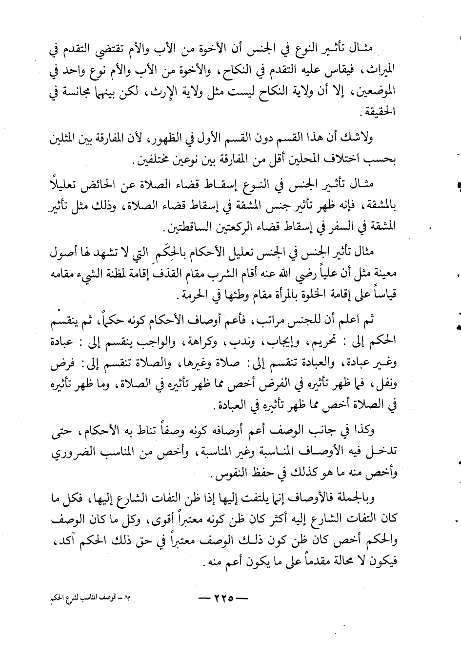 ثم اعلم أن للجنس مراتب، فأعم أوصاف الأحكام كونه حكماً، ثم ينقسم الحكم إلى: تحريم، وإيجاب، وندب، وكراهة، والواجب ينقسم إلى: عبادة، وغير عبادة، والعبادة تنقسم إلى: صلاة وغيرها، والصلاة تنقسم إلى: فرض ونفل، فما ظهر تأثيره في الفرض أخص مما ظهر تأثيره في الصلاة، وما ظهر تأثيره في الصلاة أخص مما ظهر تأثيره في العبادة.