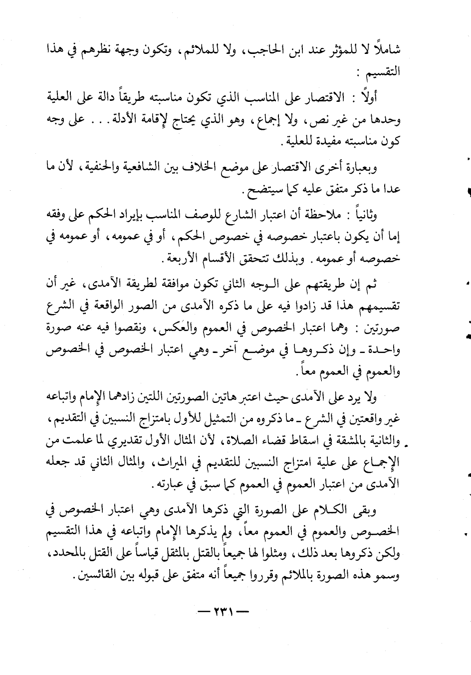 ولا يرد على الآمدي - حيث اعتبر هاتين الصورتين اللتين زادهما الإمام وأتباعه غير واقعتين في الشرع - ما ذكره من التمثيل للأول بامتزاج النسبين في التقديم، وللثانية بالمشقة في إسقاط قضاء الصلاة، لأن المثال الأول تقديري لما علمت من الإجماع على علية امتزاج النسبين للتقديم في الميراث، والمثال الثاني قد جعله الآمدي من اعتبار العموم في العموم كما سبق في عبارته.